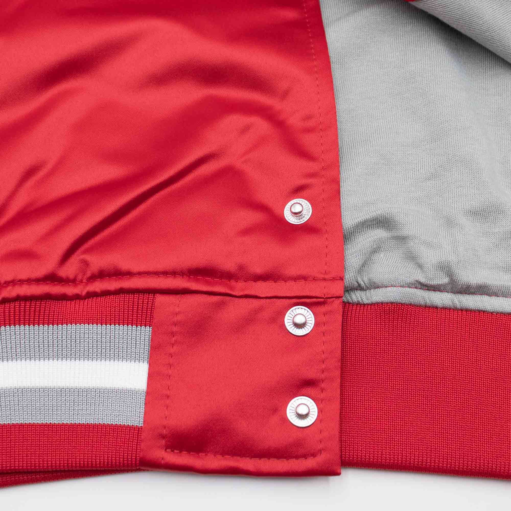 Premium Mitchell & Ness Detroit Red Wings Retro Jacke mit klassischer Satin-Außenhülle aus der offiziellen NHL Kollektion. Die NHL Jacke hat zwei äußere Taschen, eine Innentasche und eine durchgehende Knopfleiste. Das Design ist den amerikanischen College und High School Jacken nachempfunden und der Mitchell & Ness Schriftzug ist wie immer am rechten Ärmelsaum aufgestickt. Auf der Front sind der Detroit Red Wings Schriftzug und das Teamlogo hochwertig aufgenäht. Unter dem Kragen auf der Innenseite ist das Mitchell & Ness Logo aufgenäht. Das weiche Jersey-Inlay sorgt für ein absolut angenehmes Tragegefühl. Mit dem eindeutigen Eishockey Style ist diese leichte Jacke ein perfekter Begleiter für die Übergangszeit im Herbst, Frühling oder in kühlen Sommernächten.