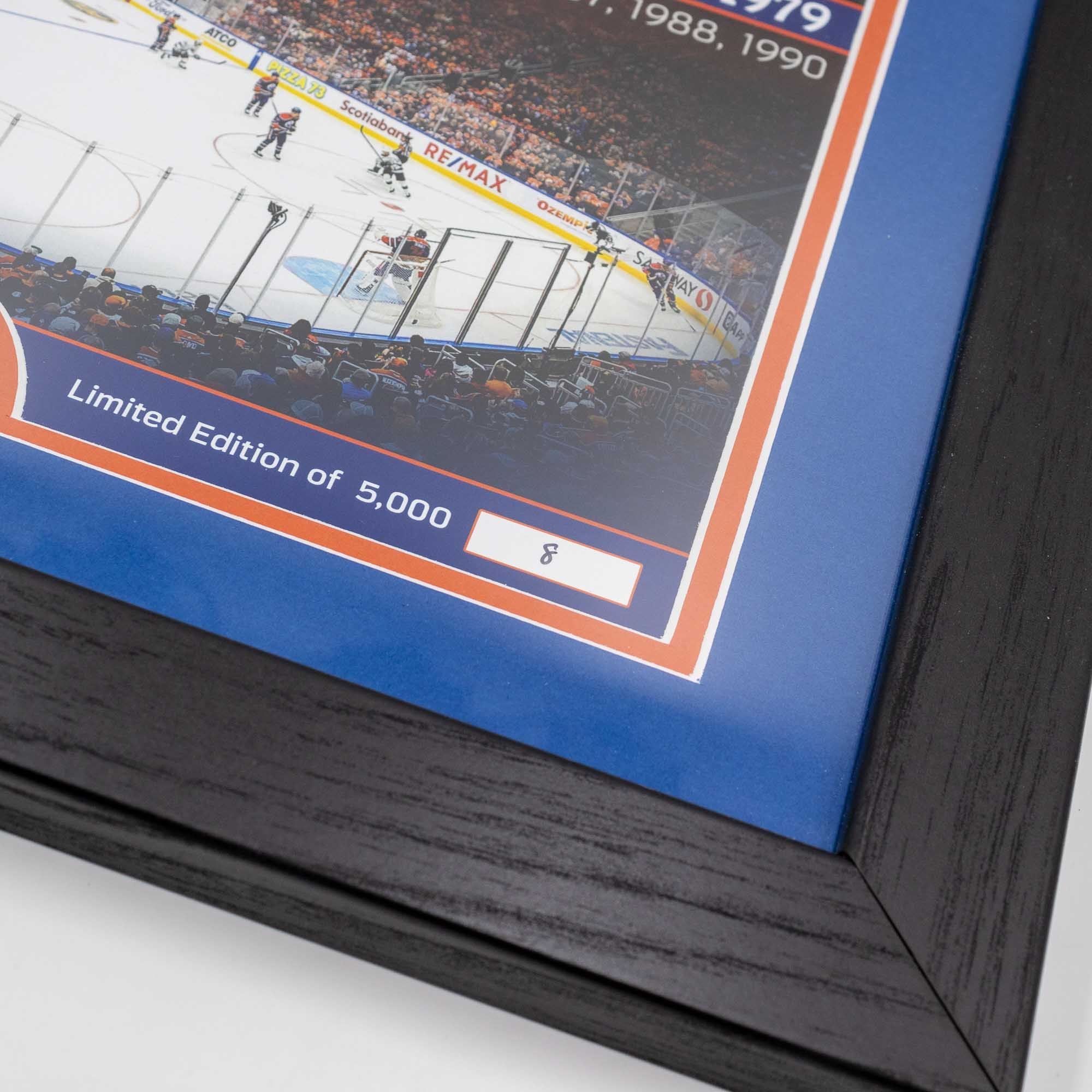Dieses 33 cm x 40 cm Kunstwerk mit doppelter Mattierung unter einer Glasfrontplatte zeigt ein individuell nummeriertes Foto von deinen Edmonton Oilers! Das kunstvoll arrangierte Bild zeigt das Edmonton Oilers Teamlogo vor dem Hintergrund der Eishockey Arena. Zusätzlich wird dieses einmalige Sammlerstück mit einer geprägten 39 mm Team Bronze-Gedenkmünze hervorgehoben. Alle Stanley Cup Championships sind ebenfalls aufgeführt.