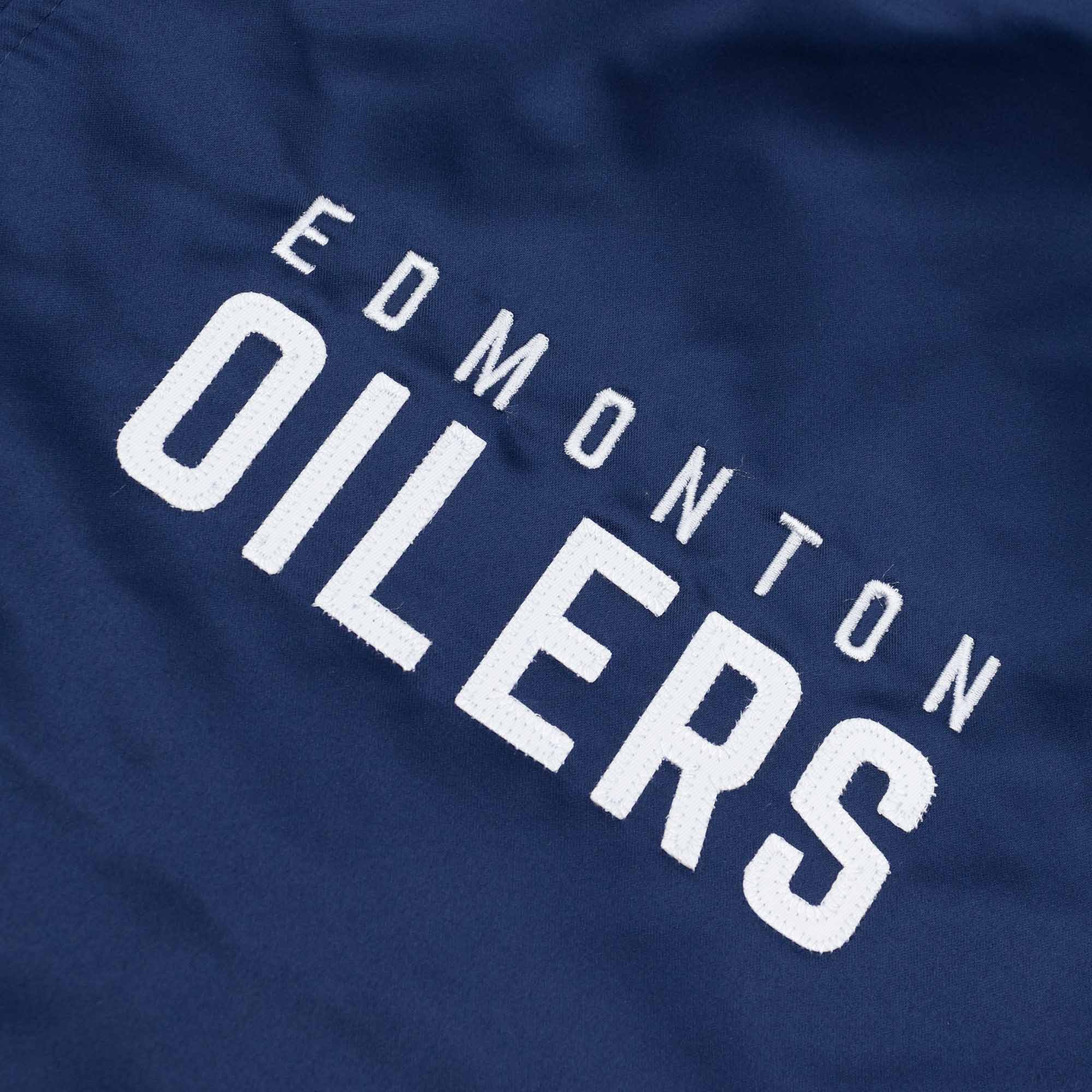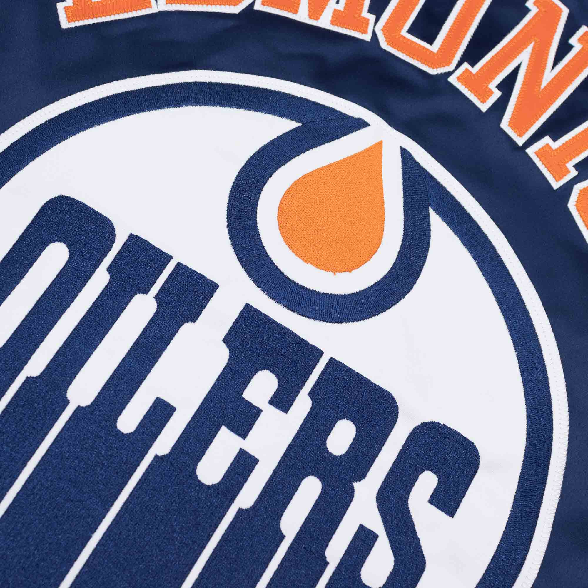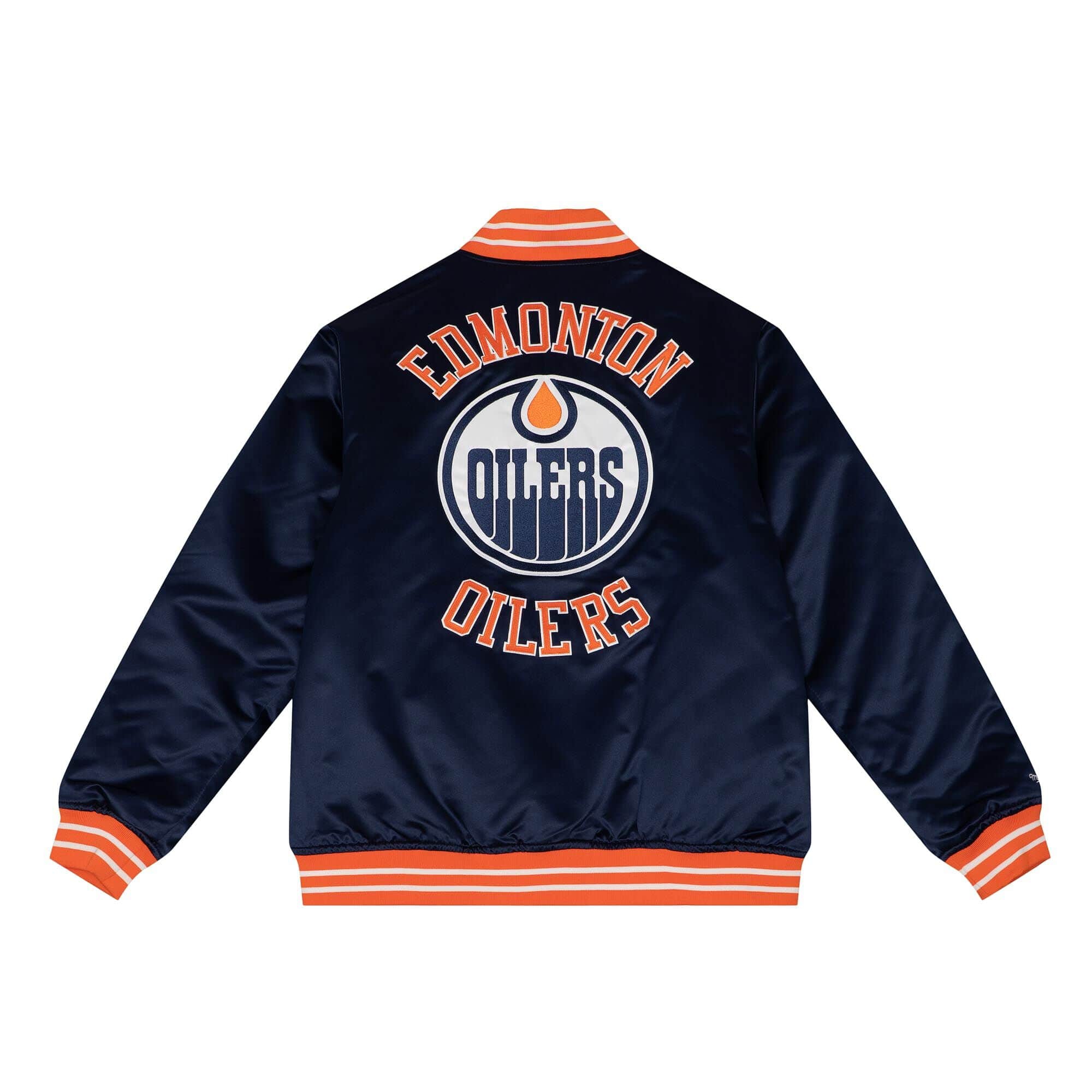 Mitchell & Ness NHL Herren Eishockey Jacke von deinen Edmonton Oilers im hochwertigen Heavyweight Satin Design.