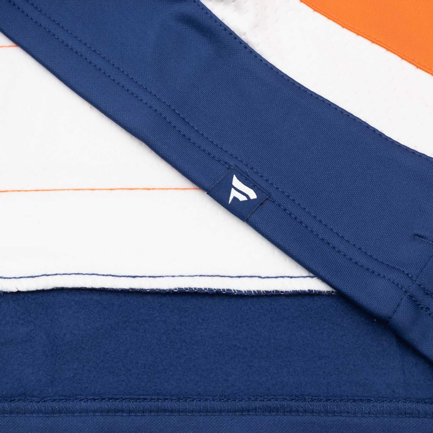 - Aufgenähte Streifen: Authentische, aufgenähte Streifen an Ärmeln und Bund im klassischen NHL-Jersey-Look.