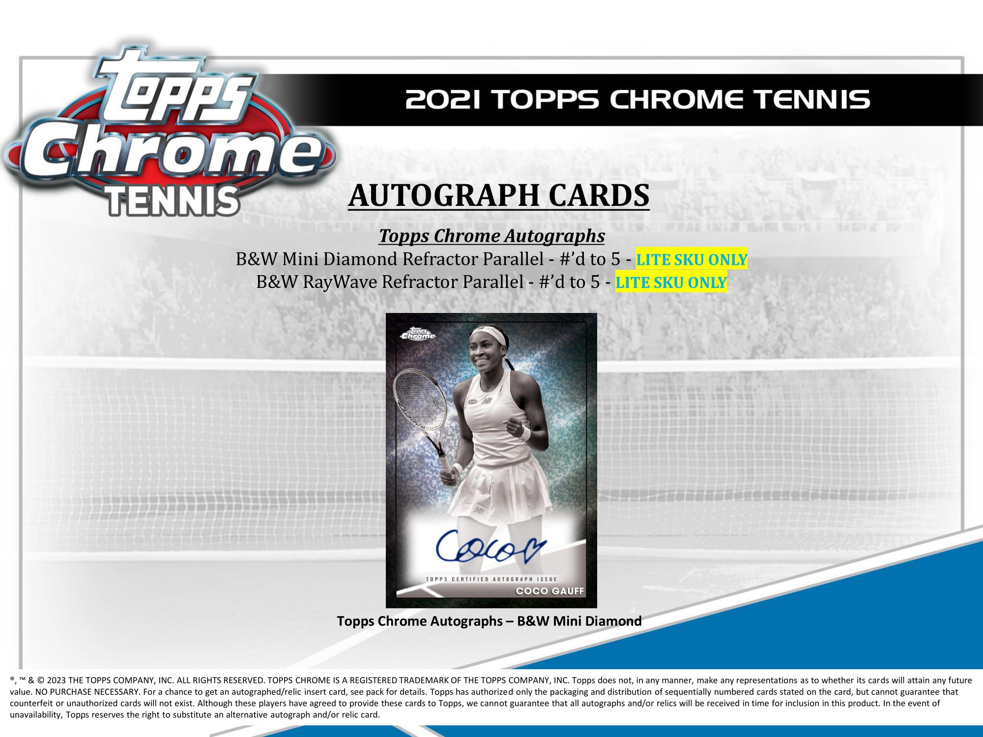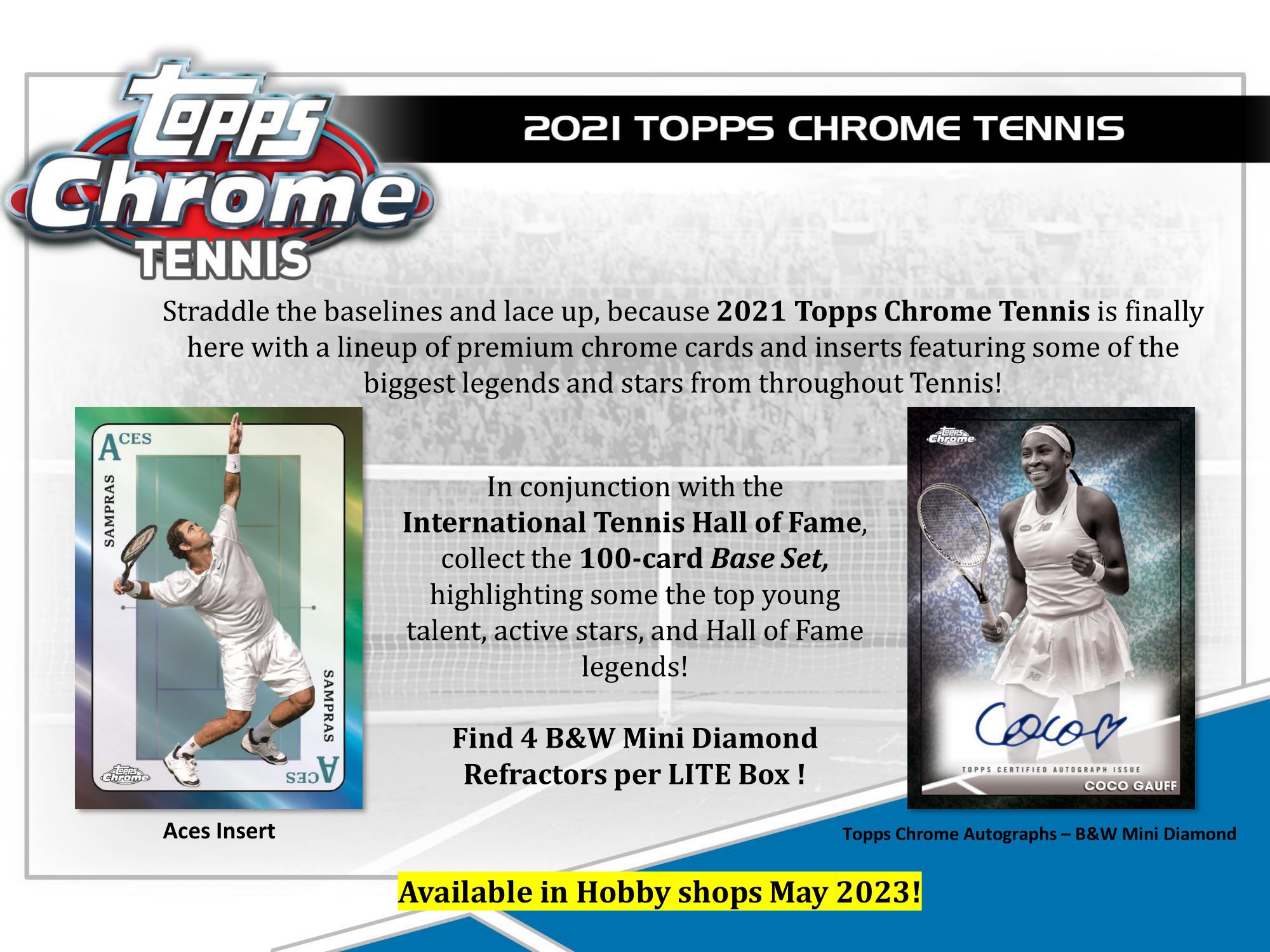 Straddle the baselines and lace up, because 2021 Topps Chrome Tennis is finally here with a lineup of premium chrome cards and inserts featuring some of the biggest legends and stars from throughout Tennis!