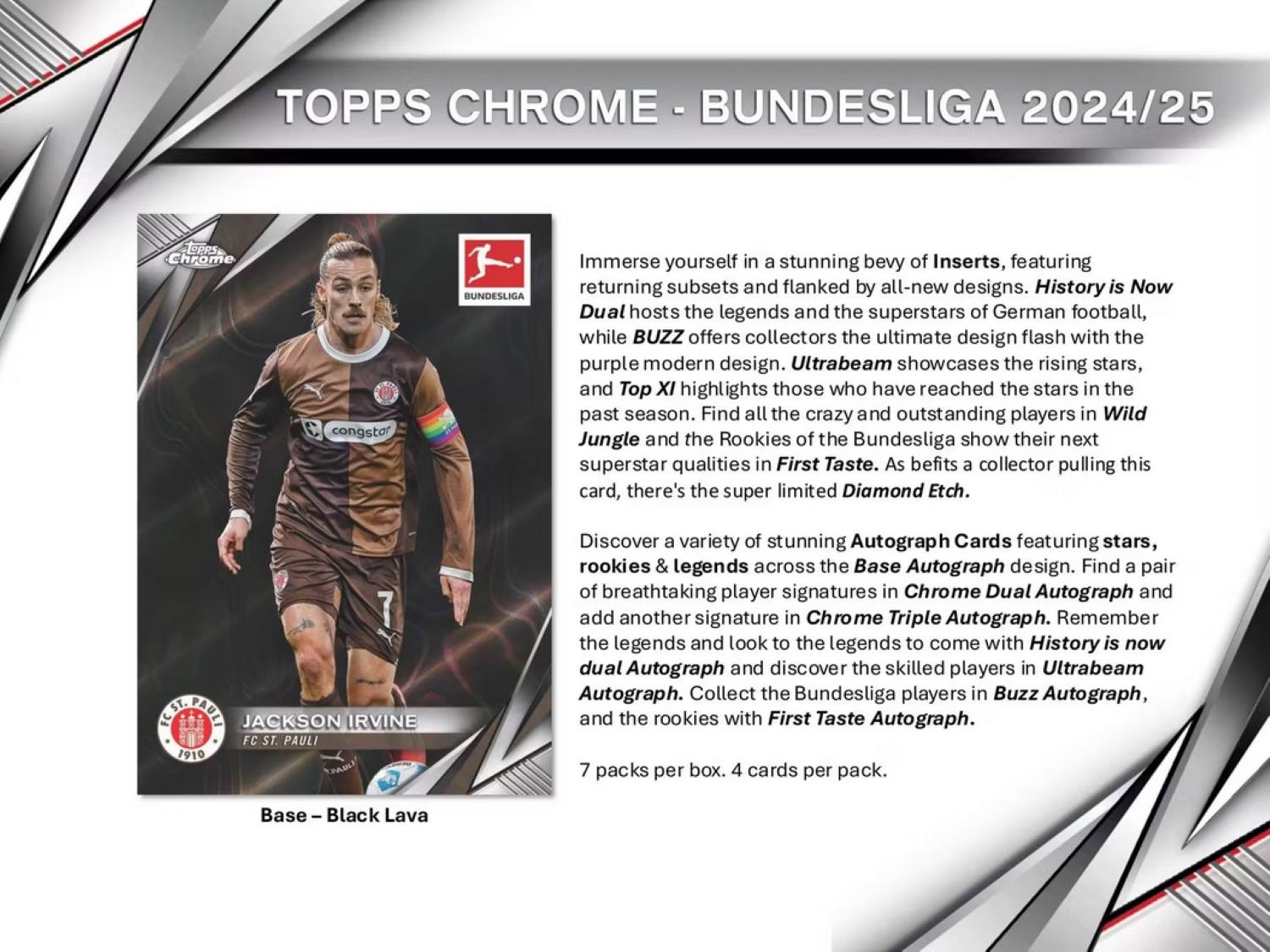 Topps Chrome returns to the Bundesliga in top form with the 2024/25 Topps Chrome Bundesliga Hobby Box! This premium release celebrates another exciting season of German football with an impressive lineup of rookies, stars, and legends - wrapped in sleek Chrome design and bursting with parallels, inserts, and stunning autograph content.