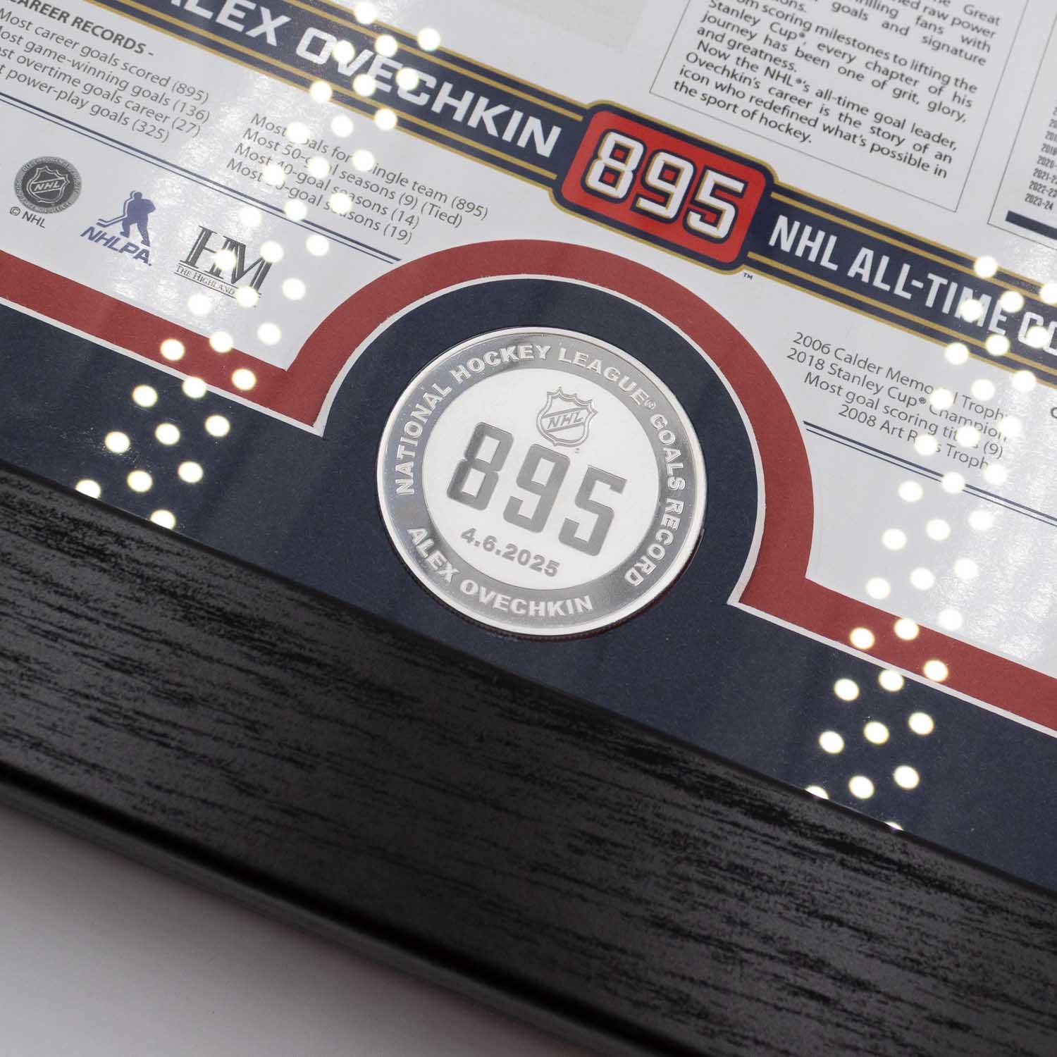 Mounted in a handcrafted frame measuring approx. 30 x 51 cm (12" x 20"), the piece includes a 39mm silver-plated Ovechkin "895 Goals" commemorative coin, double-matted under protective acrylic glass.