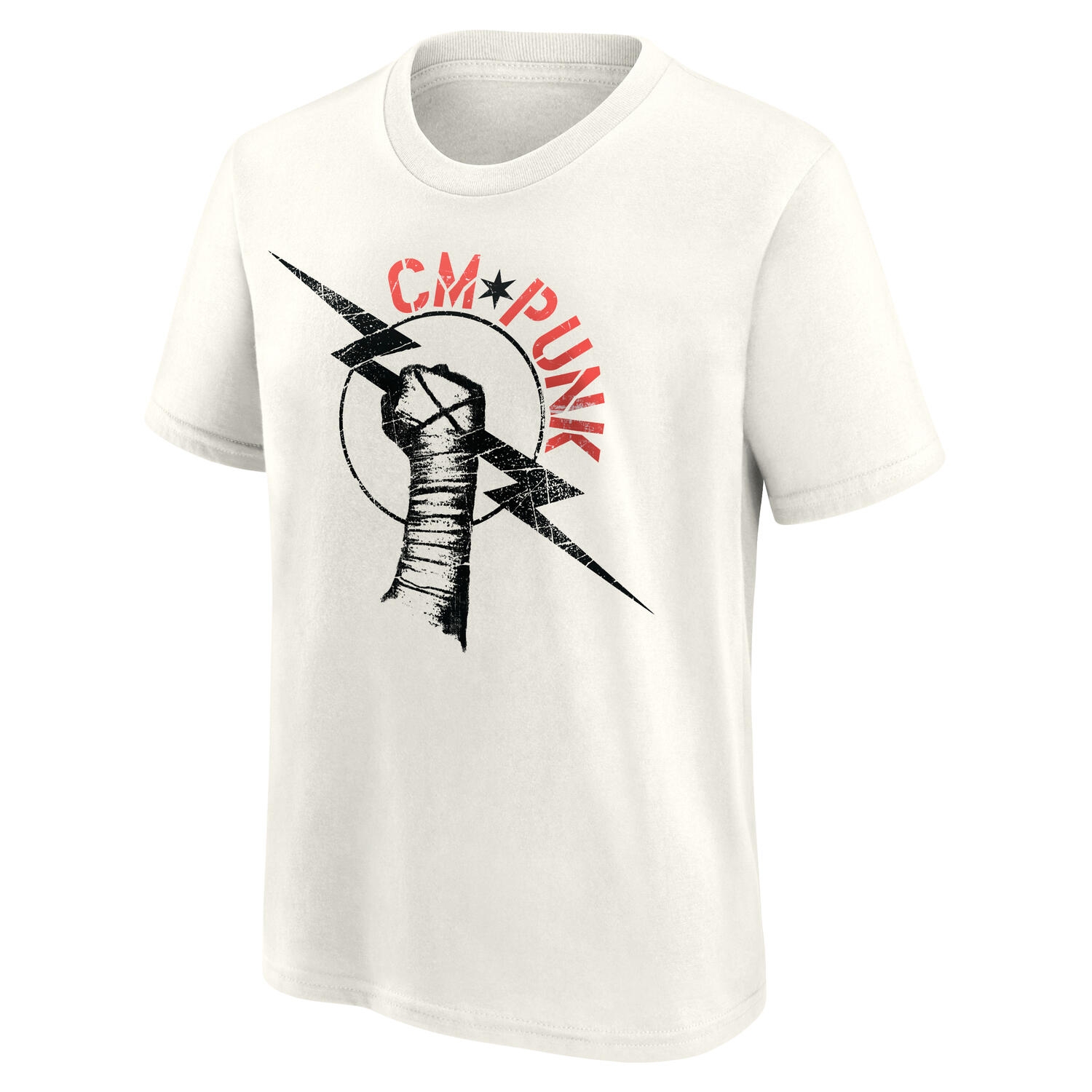 This officially licensed WWE T-shirt is perfect for young fans of the iconic wrestler, CM Punk. Featuring the bold CM Punk logo with his signature taped fist and lightning bolts, this T-shirt allows kids to show their admiration for the wrestling legend in style.