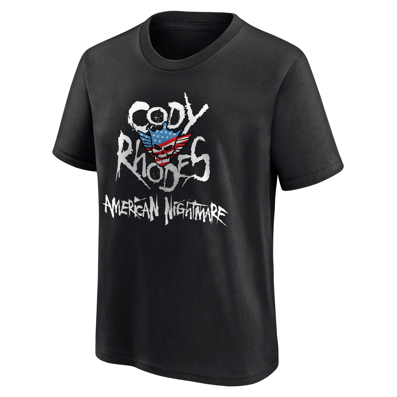 This officially licensed WWE t-shirt for kids and youth celebrates wrestling superstar Cody Rhodes, known as the "American Nightmare." The design features Cody Rhodes' name in a bold, scratched font along with his signature American flag-style emblem - perfect for young fans of the WWE icon.