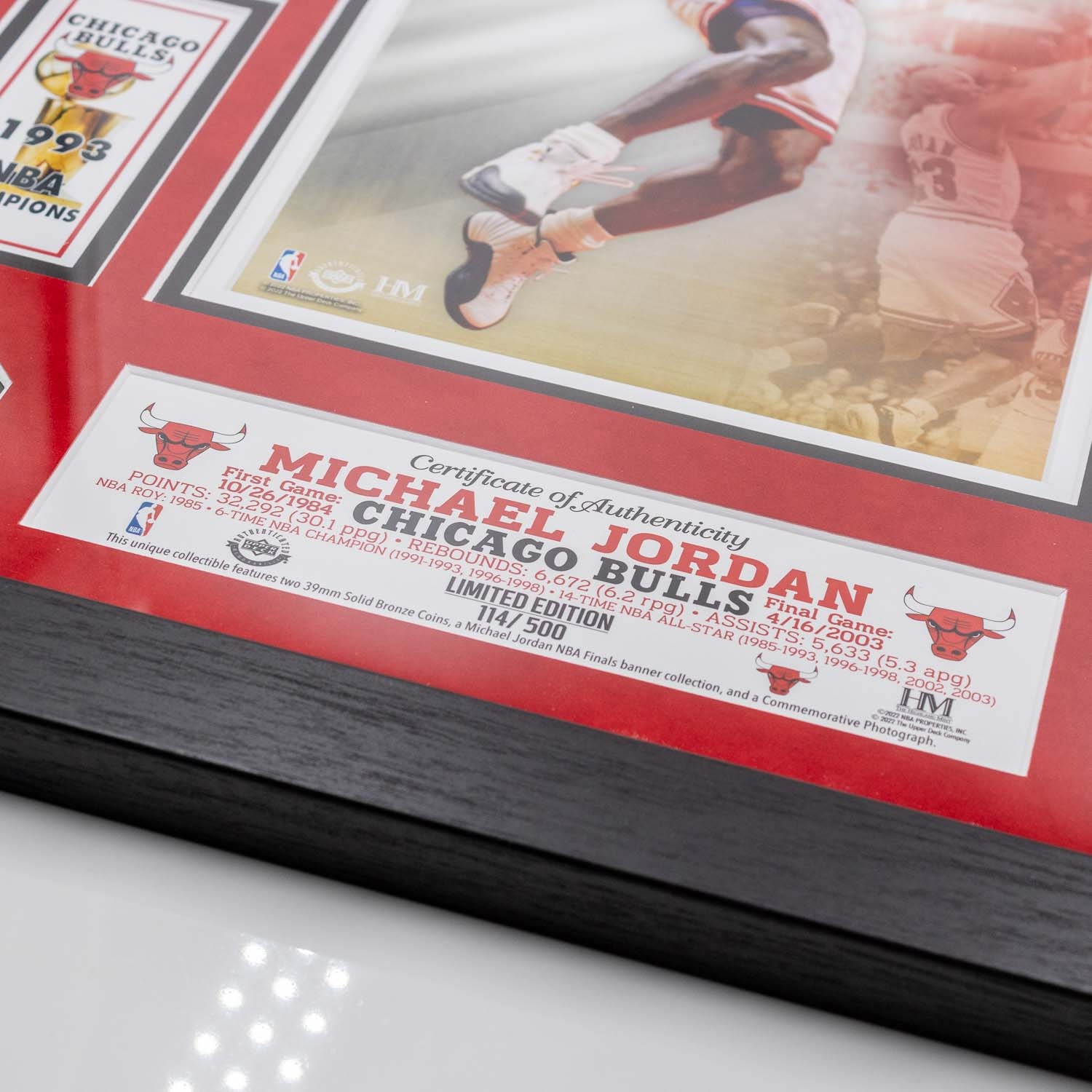 This exclusive limited-edition collectible honors NBA legend Michael Jordan with a unique commemorative photo and two minted bronze coins. The high-quality 18" x 22" (46 cm x 56 cm) black frame features double suede matting under glass, showcasing a dynamic action photo of MJ surrounded by the six championship banners won by the Chicago Bulls during his legendary career.