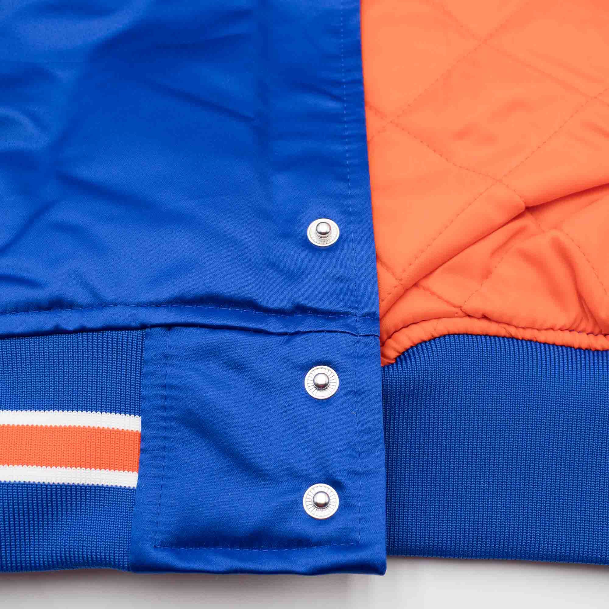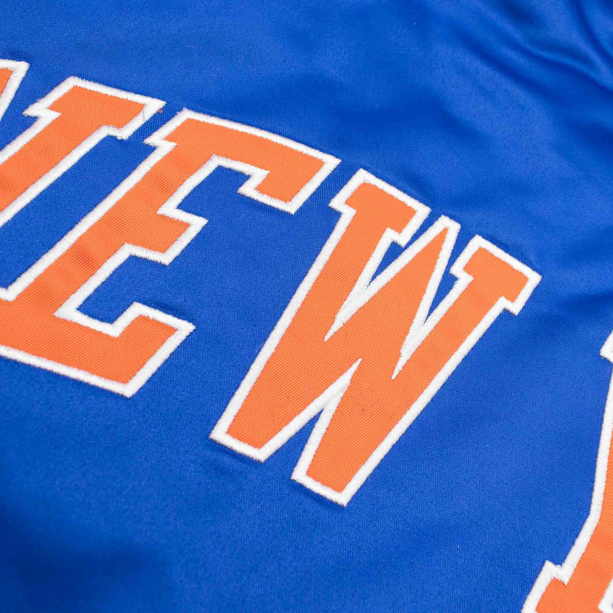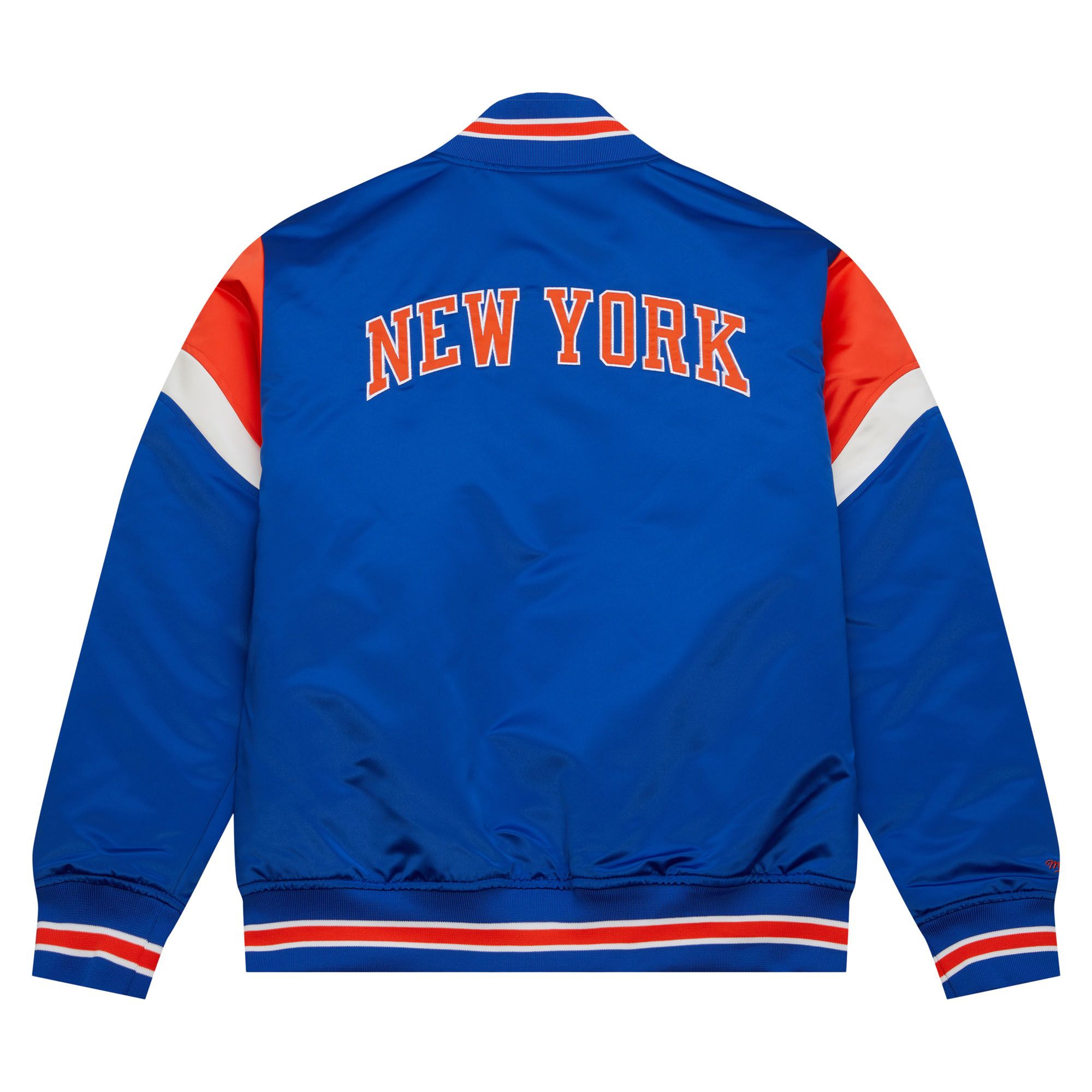 This heavyweight NBA satin jacket features New York Knicks classic team logo and HWC NBA logo embroidery on front. Mitchell & Ness logo embroidered on right sleeve cuff. Contrast color self-fabric taping on sleeves.