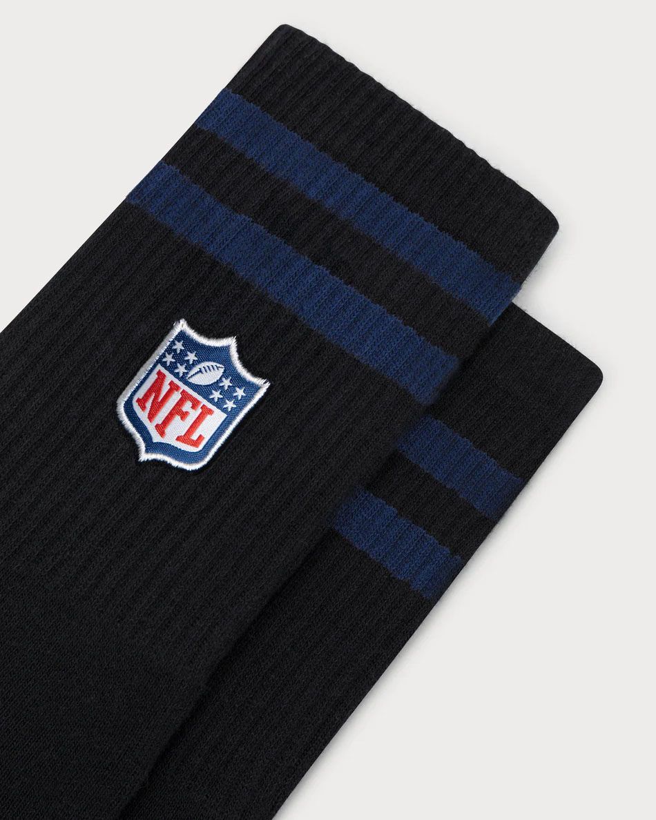 Show your team spirit with the '90 Classics Sport Crew Socks by Lobster & Lemonade. These black socks with blue stripes and a stitched NFL logo above the ankle are a stylish essential for any fan.