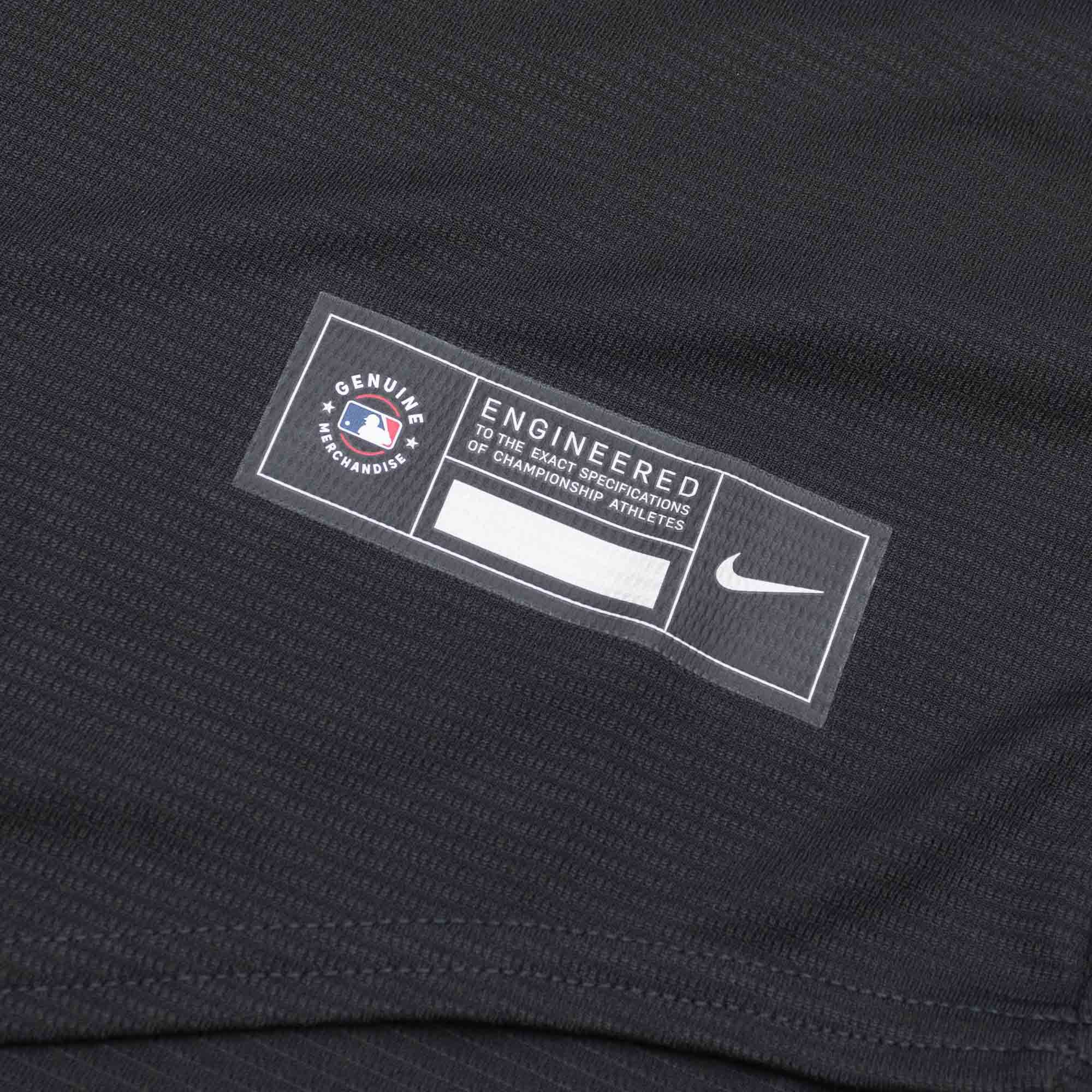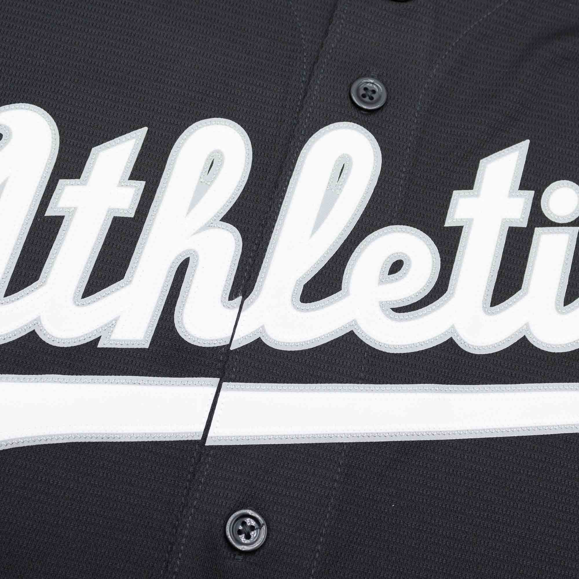 Bring your Oakland A's support to the streets with this special edition black replica baseball by Nike. The completely black baseball jersey with the gray and white team logos ensures understatement and style. This jersey features lightweight fabric and breathable button front with. A gray white printed tackle twill decoration across the full or left chest makes the official team logo pop against the braid seams. This modern fit jersey also features a tagless neckline which provides extra comfort. MLB Genuine Merchandise locker tag is located on the bottom left corner of the front.