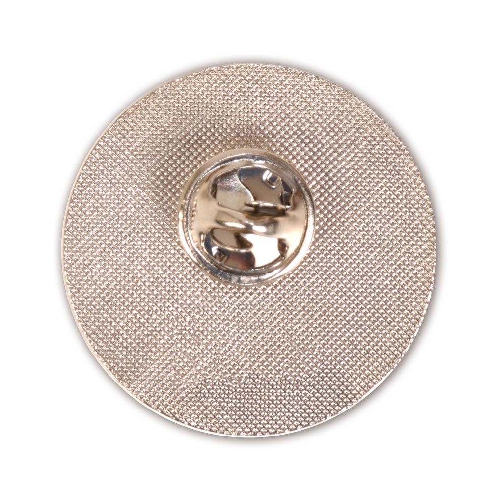 Metal pin with colorful graphics. This affordable pin is a popular item, that is lightweight and can easily be added to clothing or traded.