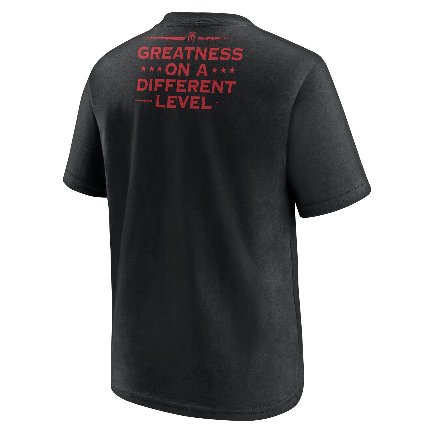 This officially licensed WWE T-shirt celebrates the superstar Roman Reigns. Featuring his unmistakable logo on the front and the phrase "Greatness on a Different Level" on the back, this T-shirt is perfect for all fans of the "Tribal Chief."