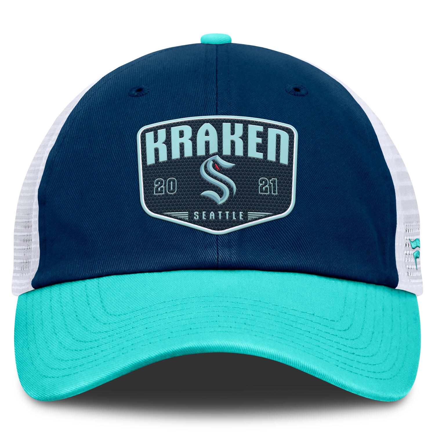 This NHL trucker cap features embroidered Seattle Kraken team patch at front. Fanatics logo on left side.