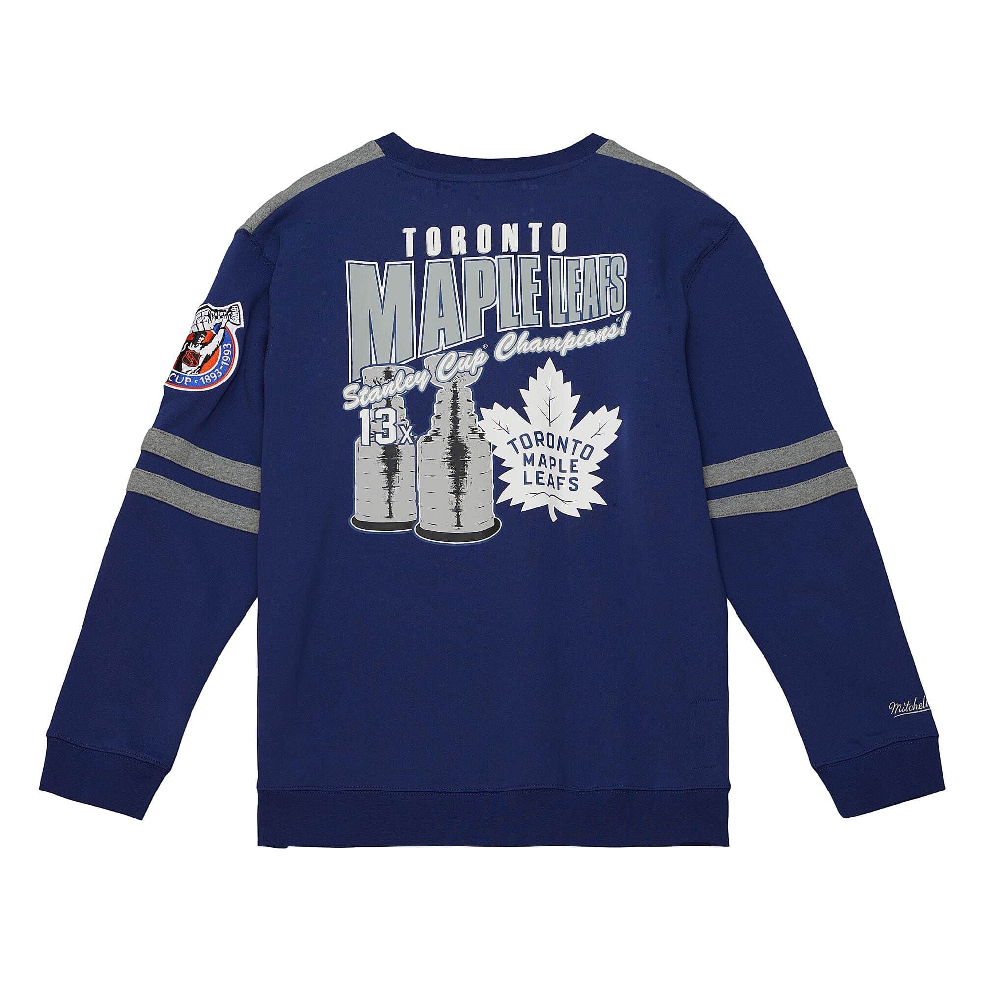 Toronto Maple Leafs crew neck sweatshirt made from a high-quality cotton-polyester fleece. Team Name and Logo screen printed on center front chest. Large Stanley Cup Champions logo print on back. Embroidered Stanley Cup logo on left sleeve and Mitchell & Ness wordmark embroidered on right bottom sleeve. Stylish, fleece top that combines a modern look with the vintage hockey coolness.