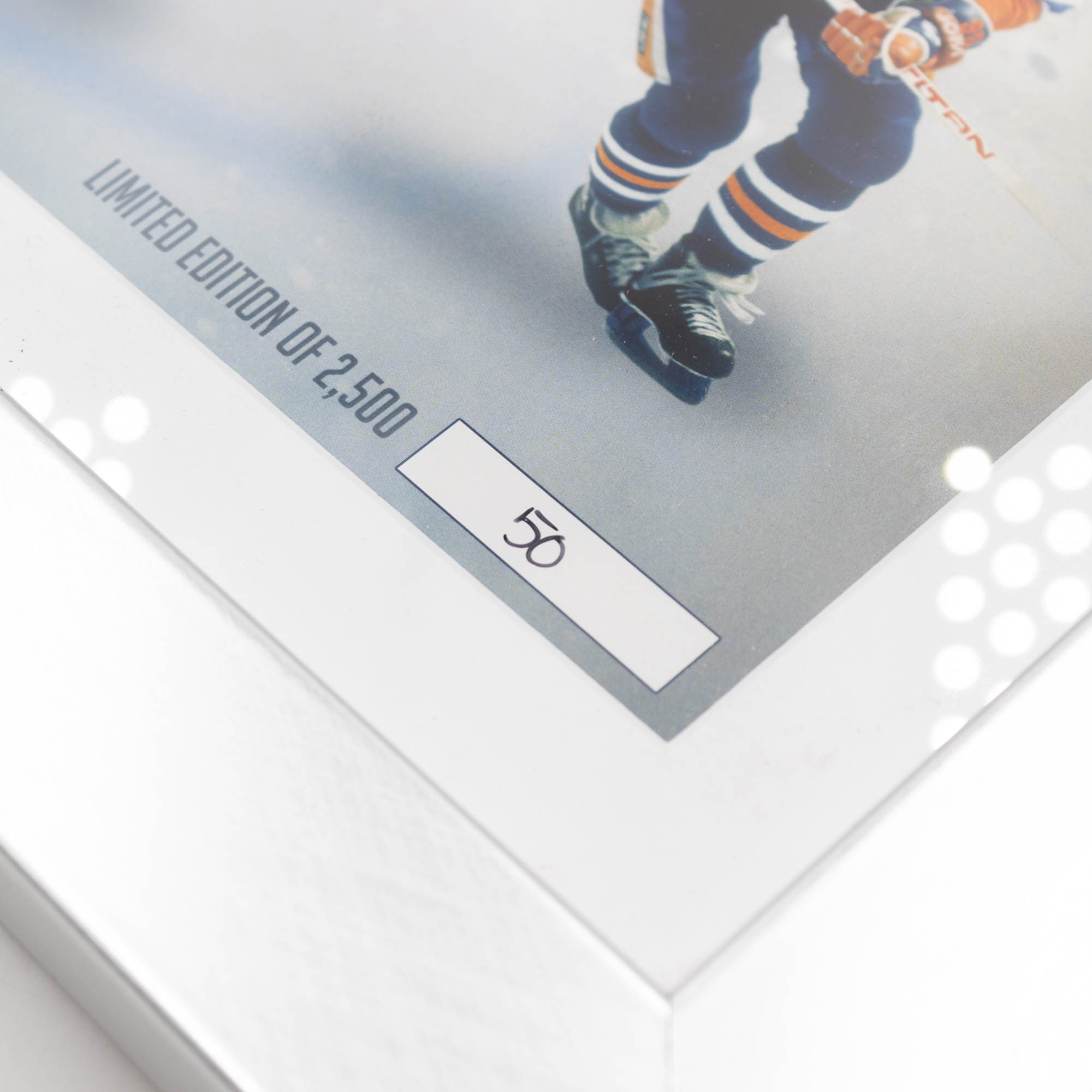 This special limited edition 12" x 20" silver wood frame commemorates Wayne Gretzky's illustrious career featuring an exclusive hand numbered photo print of the Great One in his All Star Uniform as well as in the uniforms of the 4 teams he played with in his career and his four Stanley Cups.