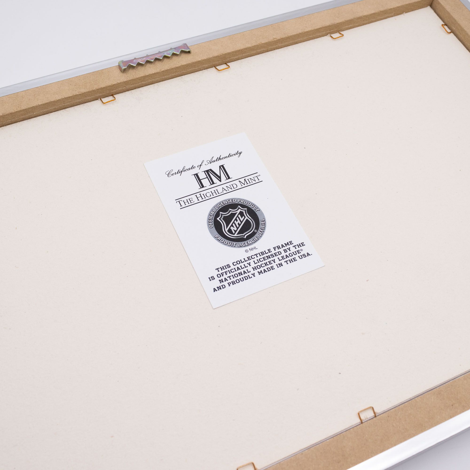 A 39mm silver plated minted Gretzky 99 coin is matted under acrylic glass with the print. A limited edition of only 2500 and officially licensed, a certificate of authenticity acompanies each frame. Proudly made in the USA by The Highland Mint!