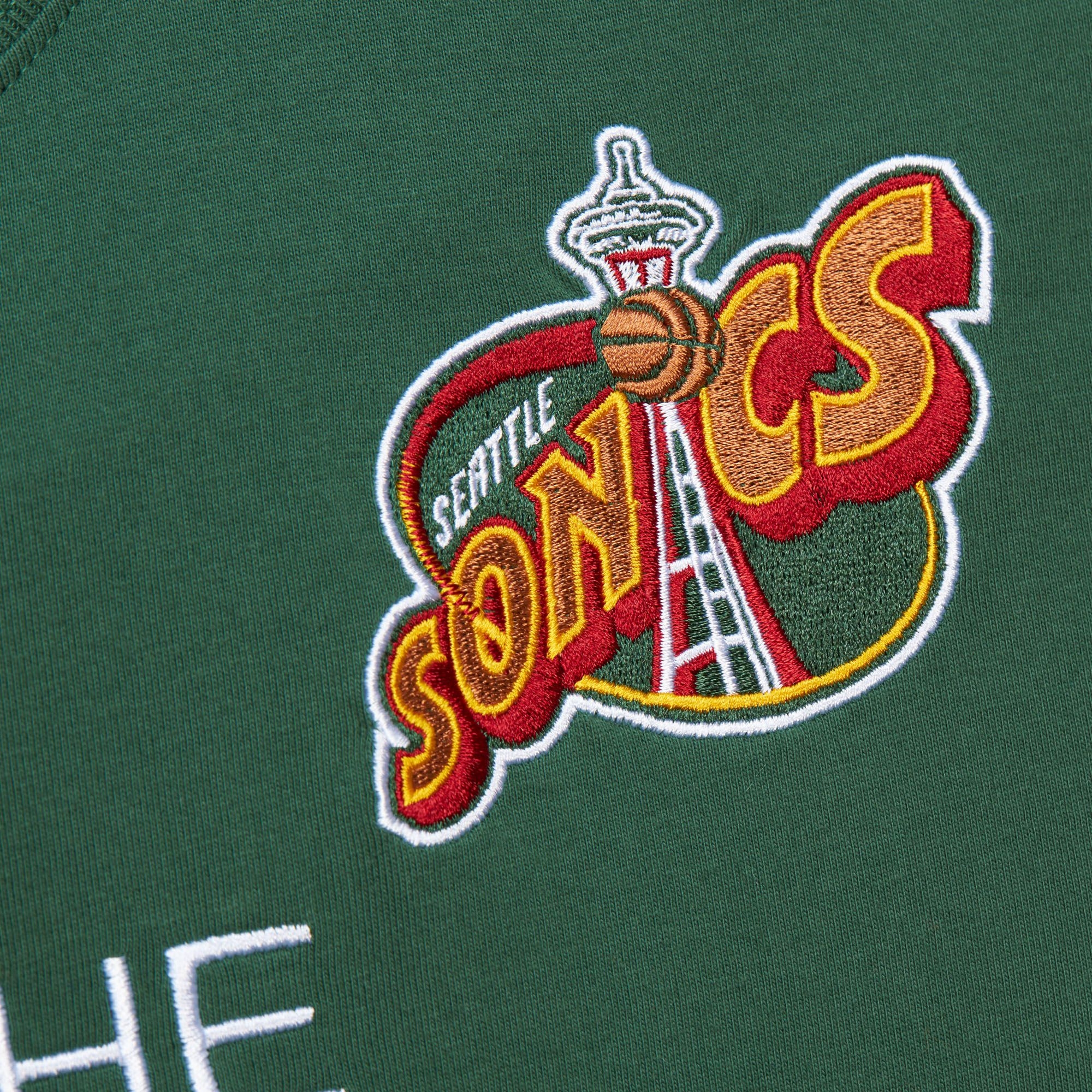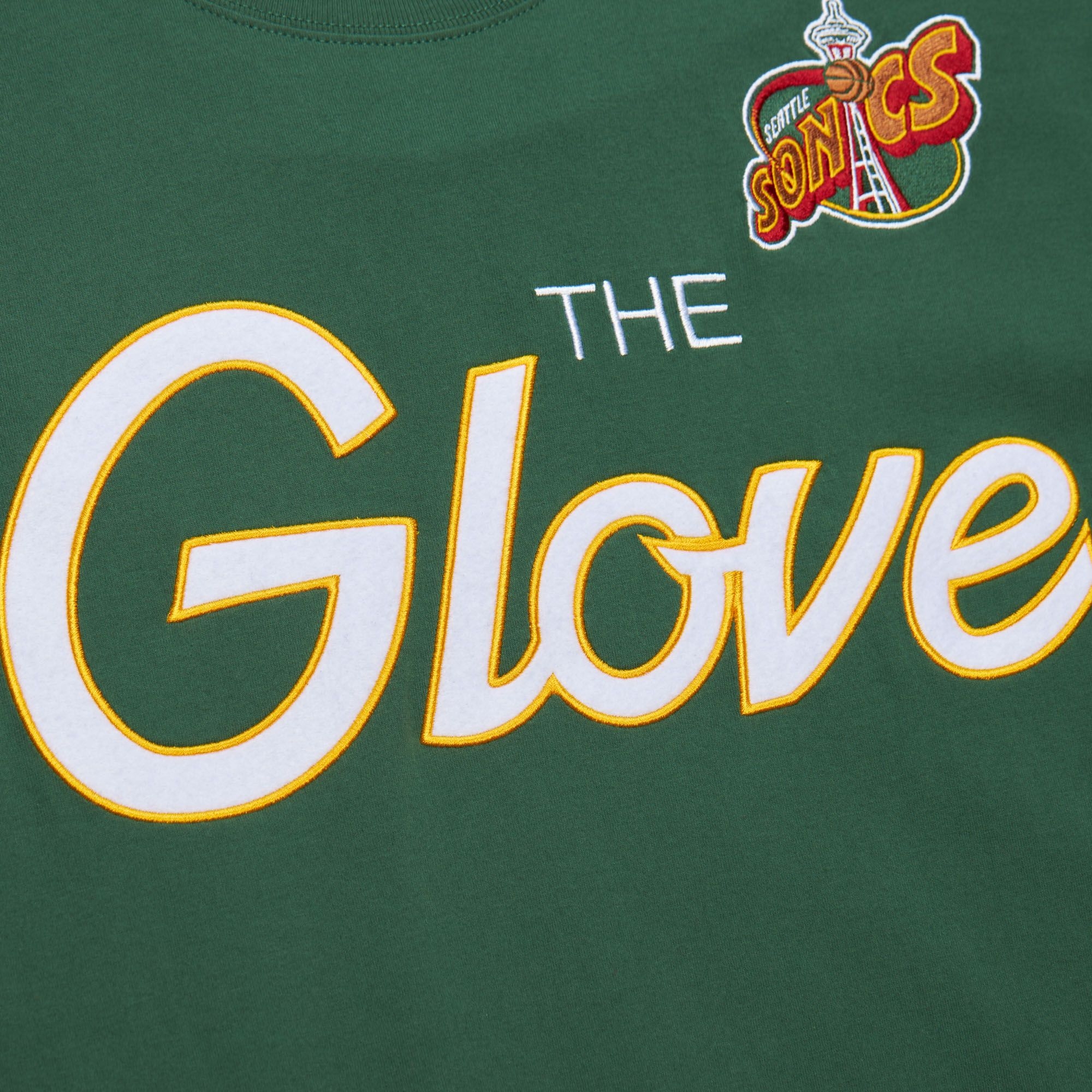 Mitchell and Ness Premium Basketball T-Shirt aus 100% extra schwerer Baumwolle (220 g/m²). Die hochwertige Verarbeitung und das Premium Material erinnern an die guten alten Zeiten, als Kleidungsstücke noch eine lange Haltbarkeit gewährleisten mussten. Die Vorderseite des NBA Tees ist hochwertig mit dem The Glove Schriftzug bestickt. Zusätzlich ist das Seattle SuperSonics Teamlogo aufgestickt. Der rechte Ärmel ist mit der Spielnummer bedruckt.