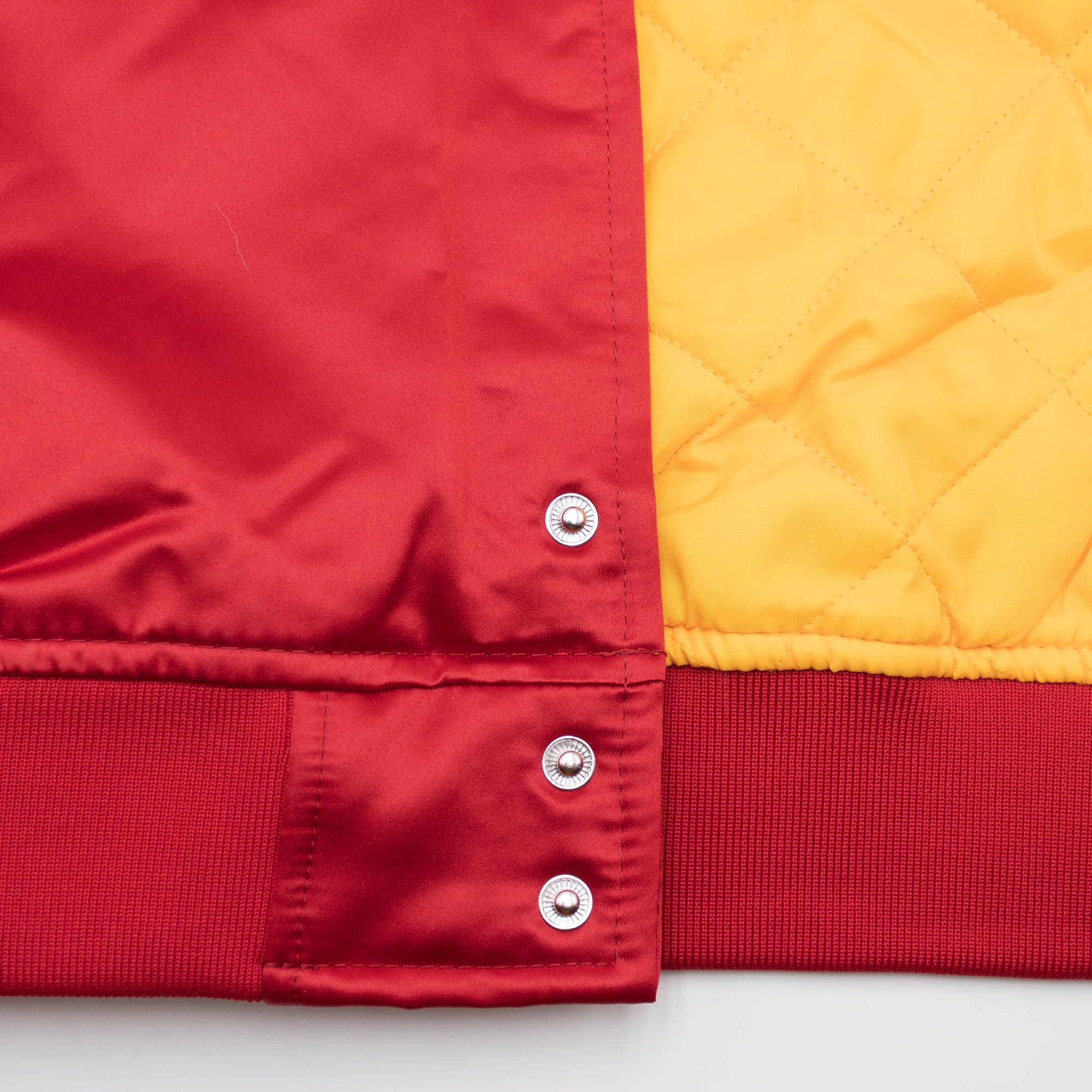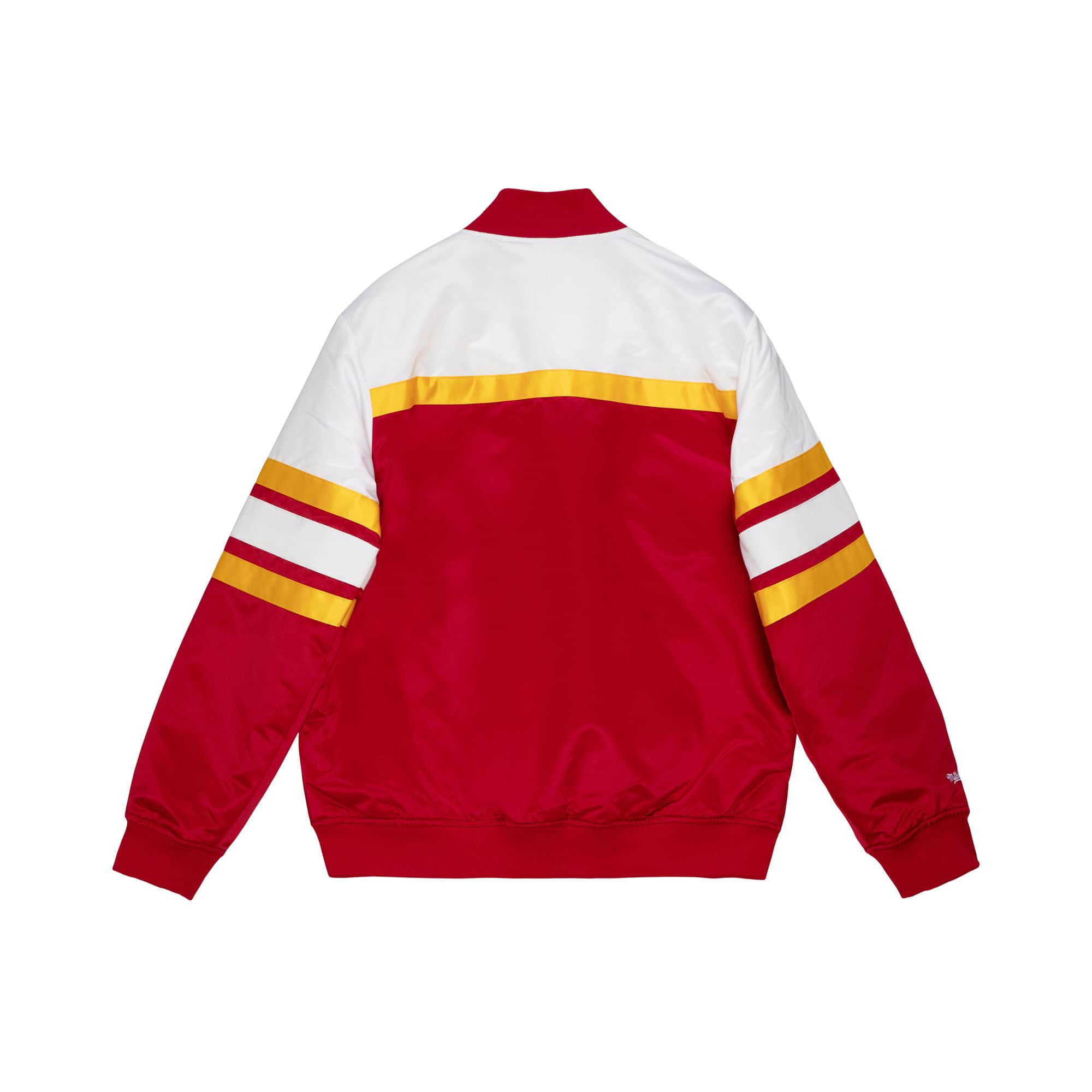 Die Mitchell and Ness Premium NBA Jacke mit klassischer Satin-Außenhülle aus der Hardwood Classics Kollektion bringt mit dem dreifarbigen Houston Rockets Teamdesign deinen Support auf die Straße. Die NBA Jacke hat zwei äußere Taschen, eine Innentasche und eine durchgehende Knopfleiste. Das Design ist den amerikanischen College und High School Jacken nachempfunden und macht mit dem glänzenden Satin-Look modisch richtig was her. Der Mitchell & Ness Schriftzug ist am rechten Ärmelsaum aufgestickt. Auf der Front sind der klassische Houston Rockets Schriftzug und das Retro-Teamlogo hochwertig aufgenäht. Abgerundet wird das Throwback-Design mit den aufgenähten Ärmelstreifen. Das mittelschwere Futter sorgt auch an kalten Tagen für eine angenehme Wärmeisolierung, die elastischen Strickbünde am Kragen, am Bund und an den Ärmelenden sorgen für den absoluten Retro-Look.