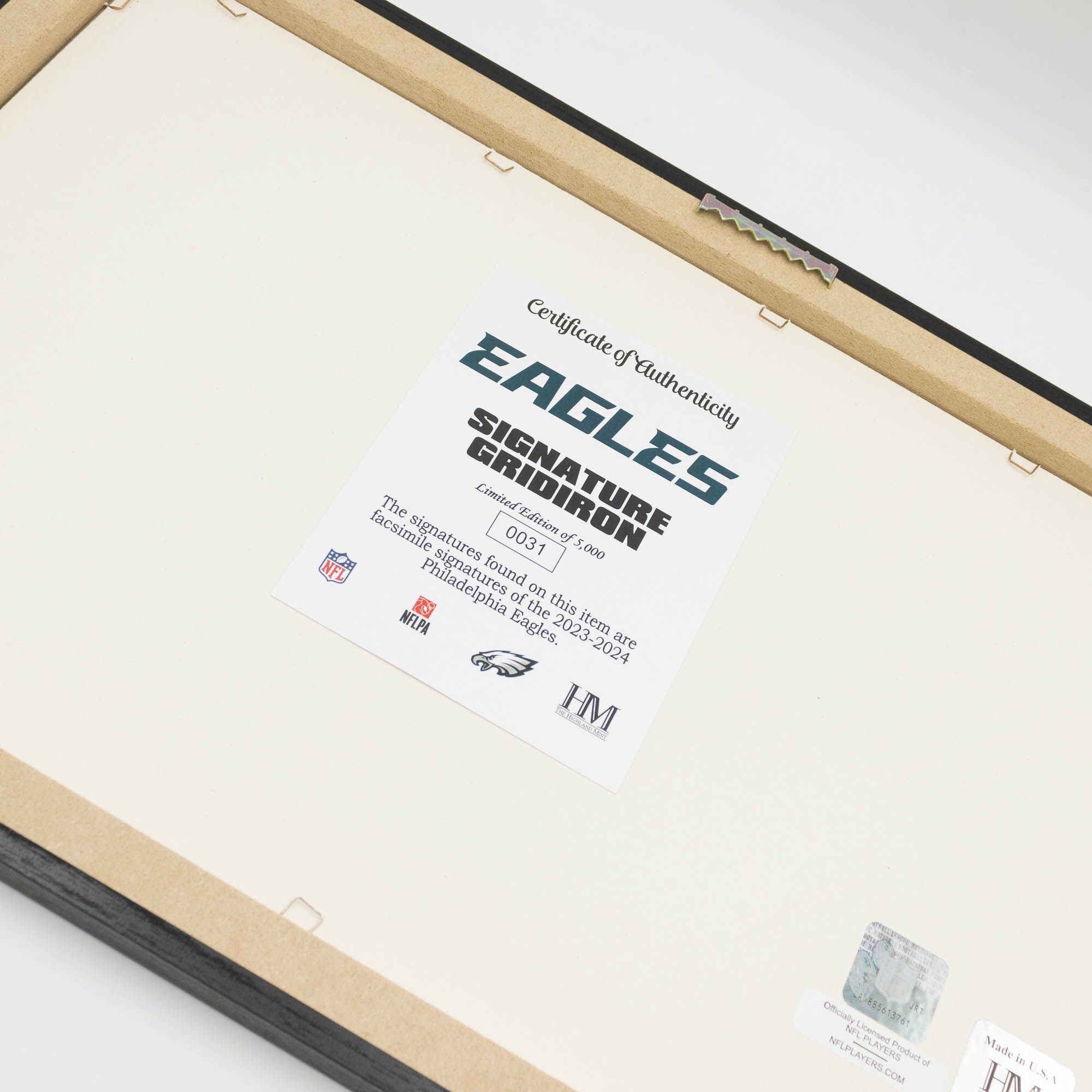 Auf der Rückseite des Bilderrahmes befindet sich das offizielle Highland Mint Echtheitszertifikat. Es handelt sich um eine handnummerierte Auflage von nur 5.000 Stück und ist eine absolute Bereicherung für jedes NFL Fan-Cave.
