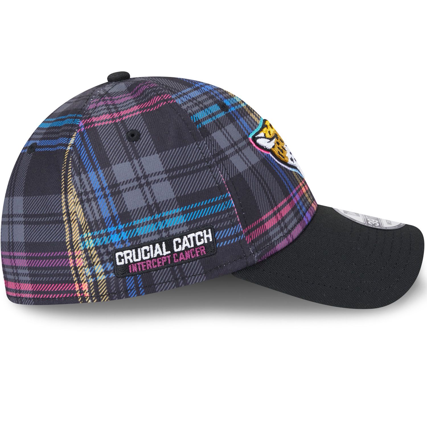 Unterstütze den weltweiten Kampf gegen Krebs mit der offiziellen New Era 2024 NFL Crucial Catch On-Field Kappe. Diese Stretch Fitted NFL Cap wird während der 2024-25 Crucial Catch Kampagne im Oktober an den NFL-Seitenlinien getragen. Die Cap ist auf der Vorderseite hochwertig mit dem bunt abgesetzten Jacksonville Jaguars Teamlogo bestickt. Die rechte Capseite ist mit dem CRUCIAL CATCH - INTERCEPT CANCER Patch bestickt. Die Rückseite ziert das aufgestickte NFL Logo. Das Sublimierte Karo-Design auf allen sechs Panels in den typischen Crucial Catch Farben sorgt für einen einzigartigen Look.