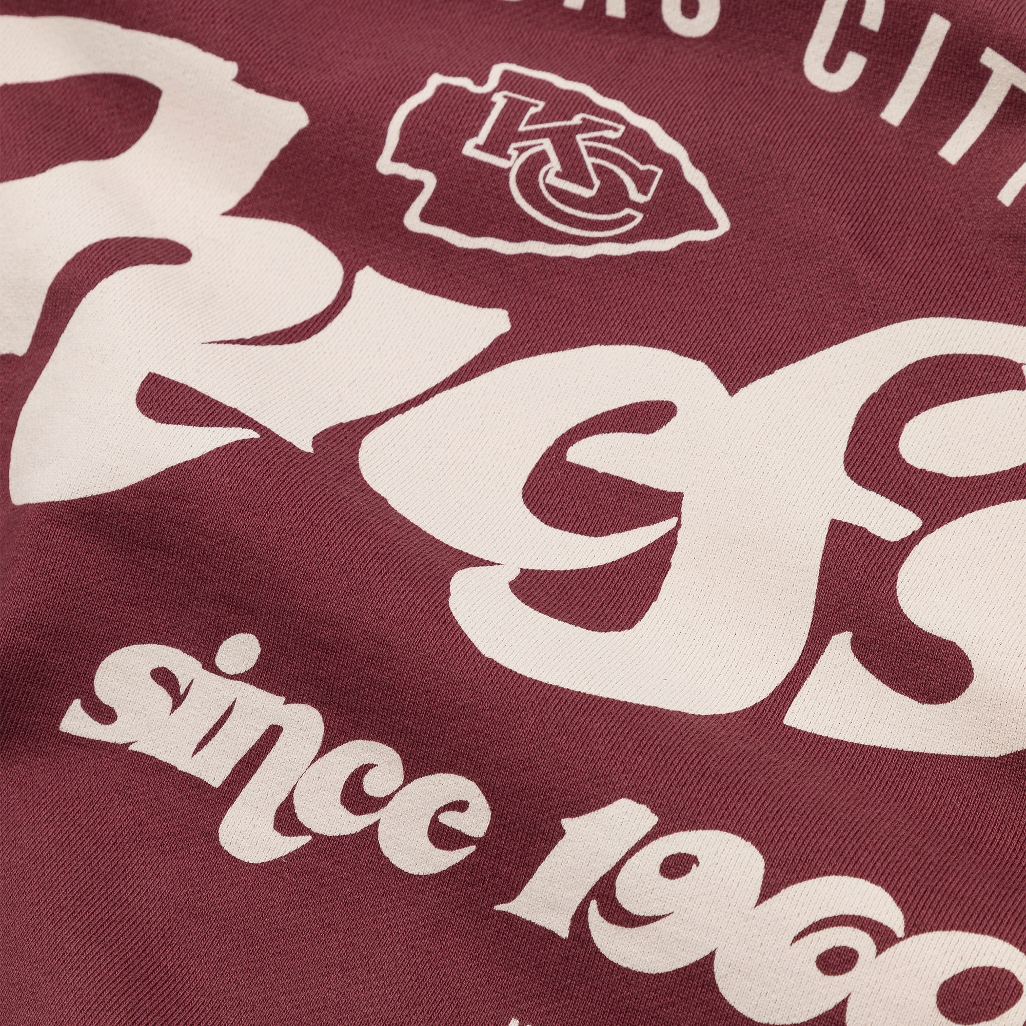 Das stückgefärbte Sweatshirt in Weinrot zeigt einen großflächigen Kansas City Chiefs Backprint in Cremefarben. Das reduzierte Chiefs Logo auf der linken Brust und das Canvas Weblabel auf Taillenhöhe machen den Retro-Look komplett.