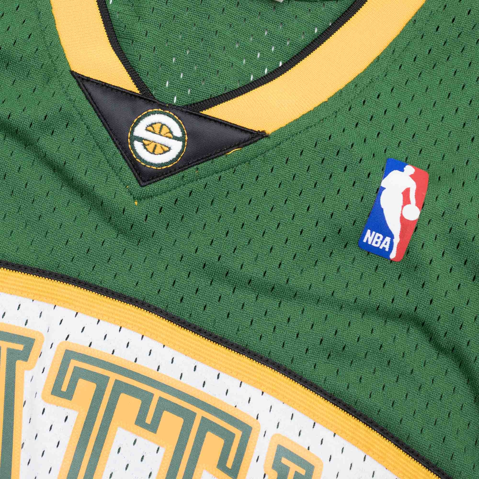 Swingman NBA-Trikot im Design der Seattle SuperSonics aus der Saison 2007-08. Das Trikotdesign entspricht den Trikots der NBA-Profis aus dieser Ära. Alle Logos, Buchstaben und Zahlen sind als hochwertig bedruckter Webepatch im Thermodruckverfahren aufgebracht. Das Mitchell & Ness Hardwood Classics Label am Saum ist ebenso aufgenäht.