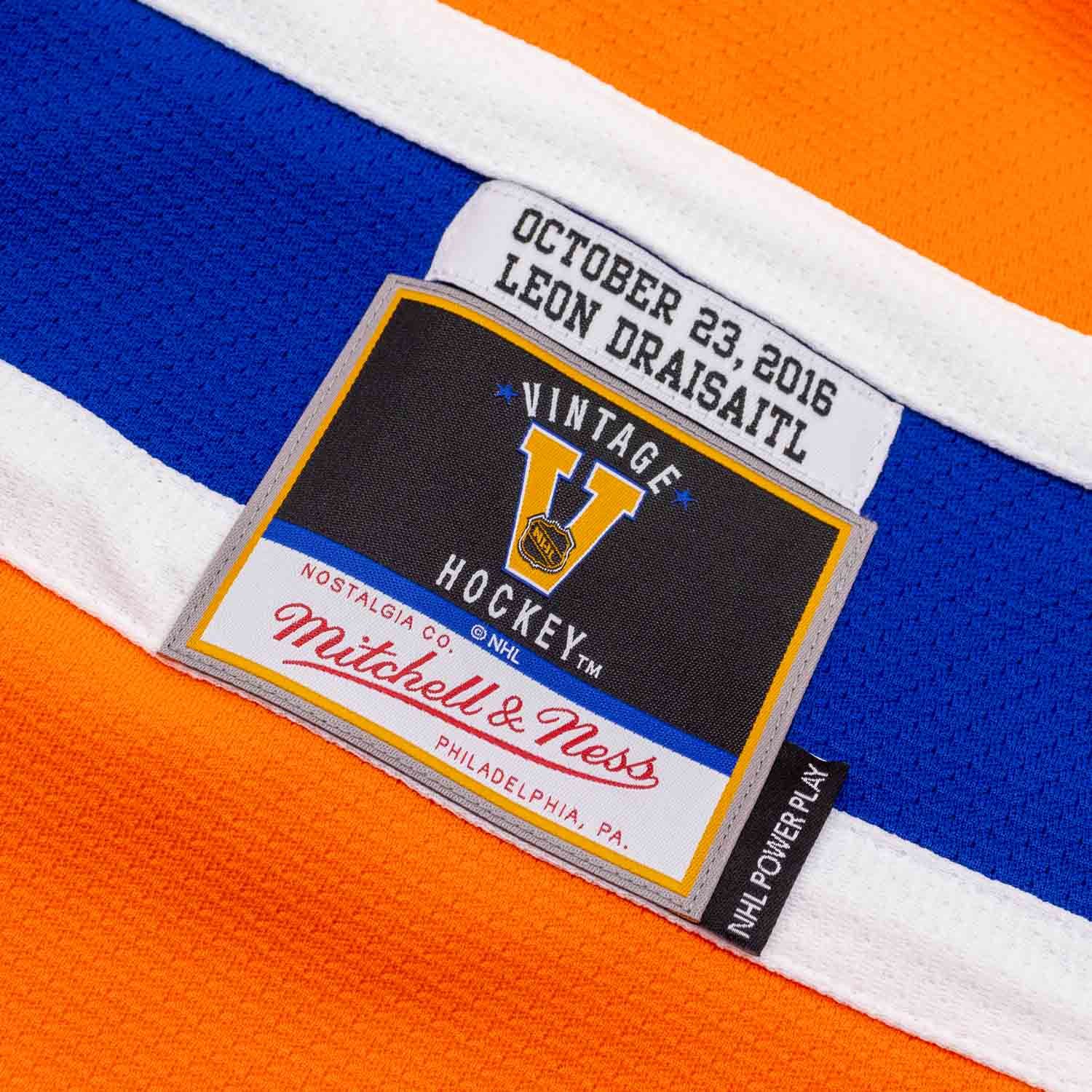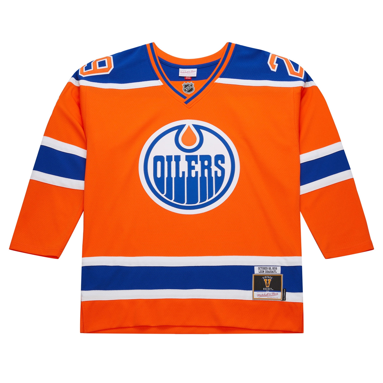 Mitchell & Ness NHL Herren Power Play Eishockey Trikot von Edmonton Oilers Superstar Leon Draisaitl im 2016 Heritage Classic Design.