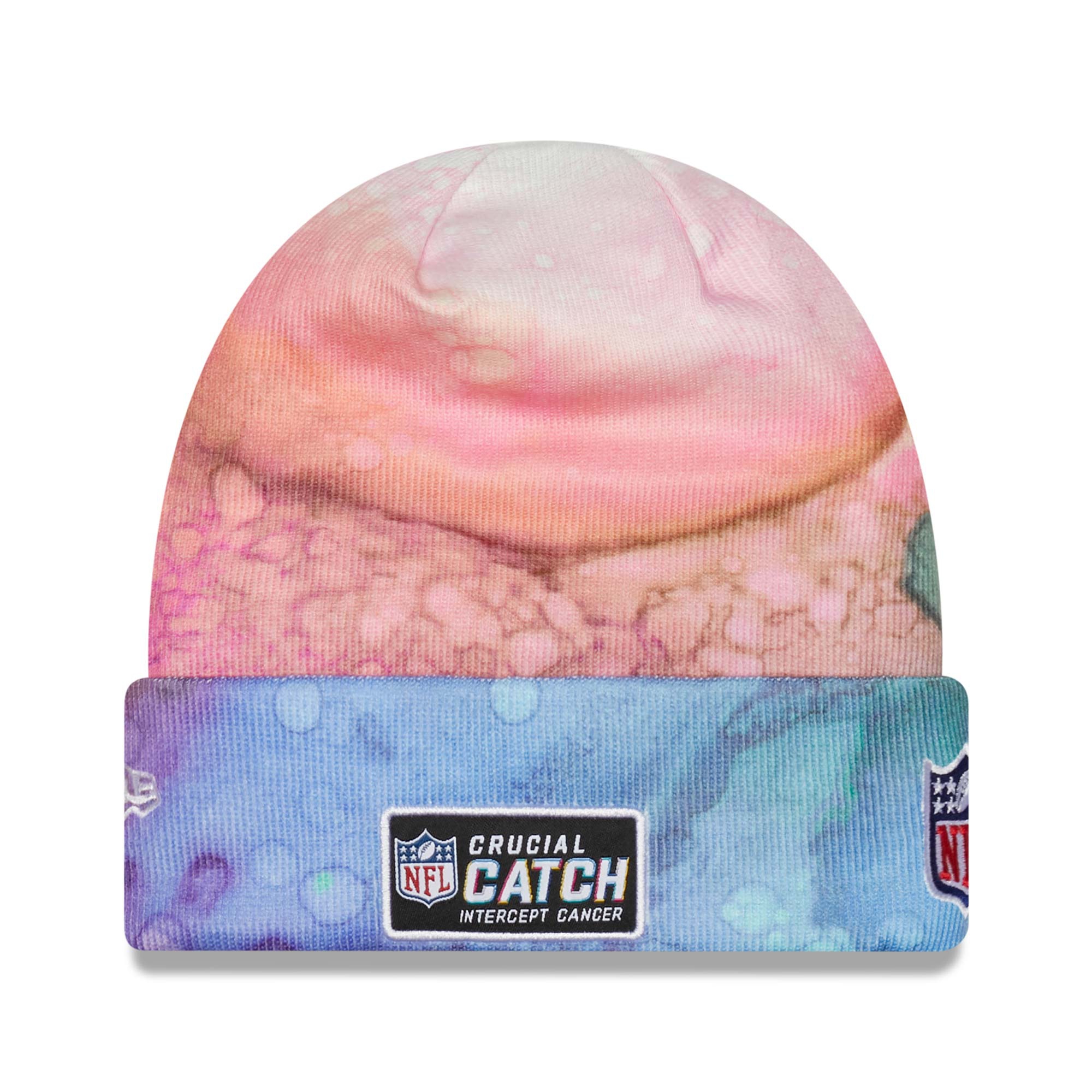 Unterstütze den weltweiten Kampf gegen Krebs mit der offiziellen New Era 2022 NFL Crucial Catch On-Field Wintermütze. Dieser Beanie wird während der 2022/23 Crucial Catch Kampagne an den NFL-Seitenlinien getragen. Die bunte Mütze im pinken Ink Dye Look ist auf der Vorderseite hochwertig mit dem schwarz-weißen Los Angeles Chargers Teamlogo bestickt. Die Rückseite ist mit dem CRUCIAL CATCH - INTERCEPT CANCER Patch bestickt, während die rechte Mützenseite mit dem offizielle NFL Sideline Shield bestickt ist.Das warme Thermo-Fleece-Futter auf der Innenseite hilft die kalte Winterzeit zu überstehen und eignet sich durch seine Performance-Eigenschaften auch zum Einsatz beim Sport etc. Der Umschlag bietet zusätzlich einen extra Schutz für deine Ohren.