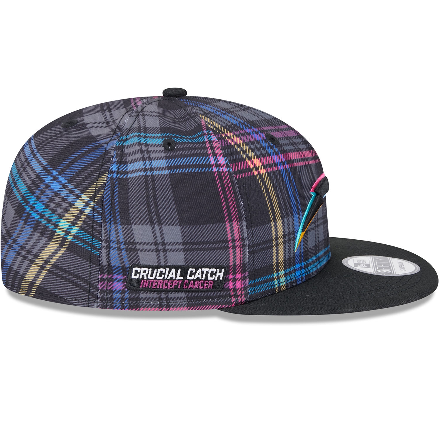 Unterstütze den weltweiten Kampf gegen Krebs mit der offiziellen New Era 2024 NFL Crucial Catch On-Field Kappe. Diese NFL Cap mit verstellbarem Verschluss wird während der 2024-25 Crucial Catch Kampagne im Oktober an den NFL-Seitenlinien getragen. Die Cap ist auf der Vorderseite hochwertig mit dem bunt abgesetzten Los Angeles Chargers Teamlogo bestickt. Die rechte Capseite ist mit dem CRUCIAL CATCH - INTERCEPT CANCER Patch bestickt. Die Rückseite ziert das aufgestickte NFL Logo. Das Sublimierte Karo-Design auf allen sechs Panels in den typischen Crucial Catch Farben sorgt für einen einzigartigen Look.