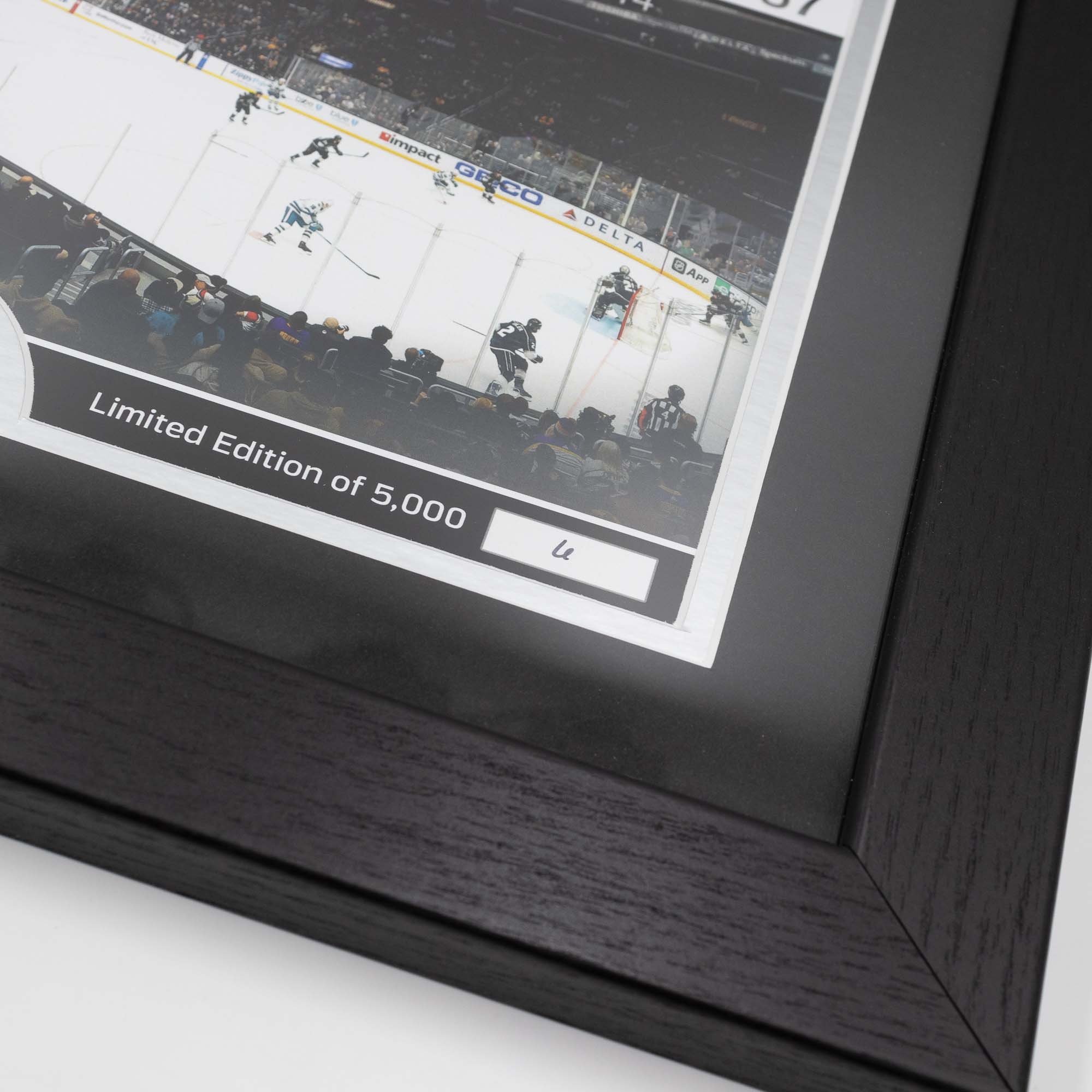 Dieses 33 cm x 40 cm Kunstwerk mit doppelter Mattierung unter einer Glasfrontplatte zeigt ein individuell nummeriertes Foto von deinen Los Angeles Kings! Das kunstvoll arrangierte Bild zeigt das Los Angeles Kings Teamlogo vor dem Hintergrund der Eishockey Arena. Zusätzlich wird dieses einmalige Sammlerstück mit einer geprägten 39 mm Team Bronze-Gedenkmünze hervorgehoben. Alle Stanley Cup Championships sind ebenfalls aufgeführt.