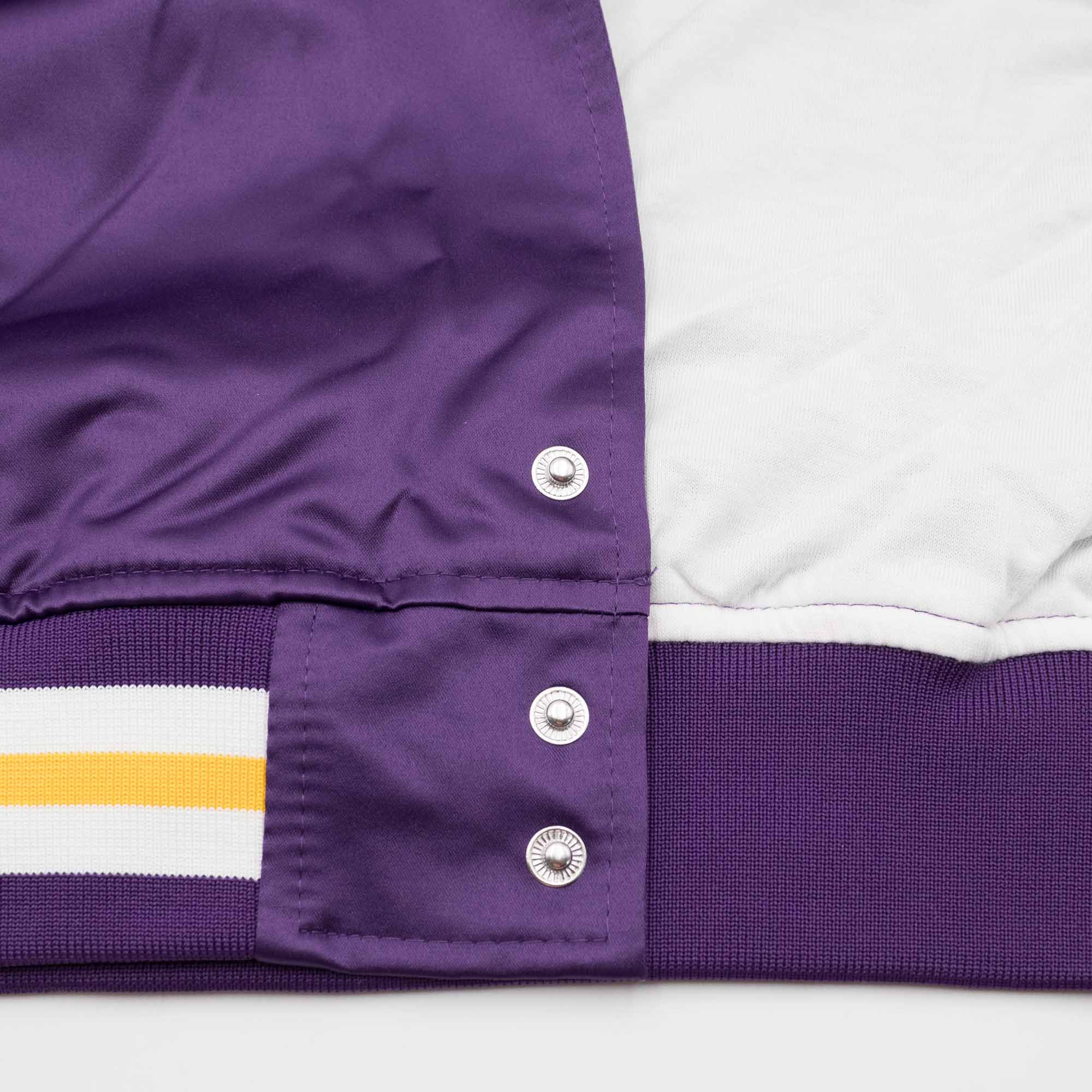 Premium Mitchell and Ness Los Angeles Lakers Retro Jacke mit klassischer Satin-Außenhülle aus der Hardwood Classics Kollektion. Die NBA Jacke hat zwei äußere Taschen, eine Innentasche und eine durchgehende Knopfleiste. Das Design ist den amerikanischen College und High School Jacken nachempfunden und der Mitchell & Ness Schriftzug ist wie immer am rechten Ärmelsaum aufgestickt.