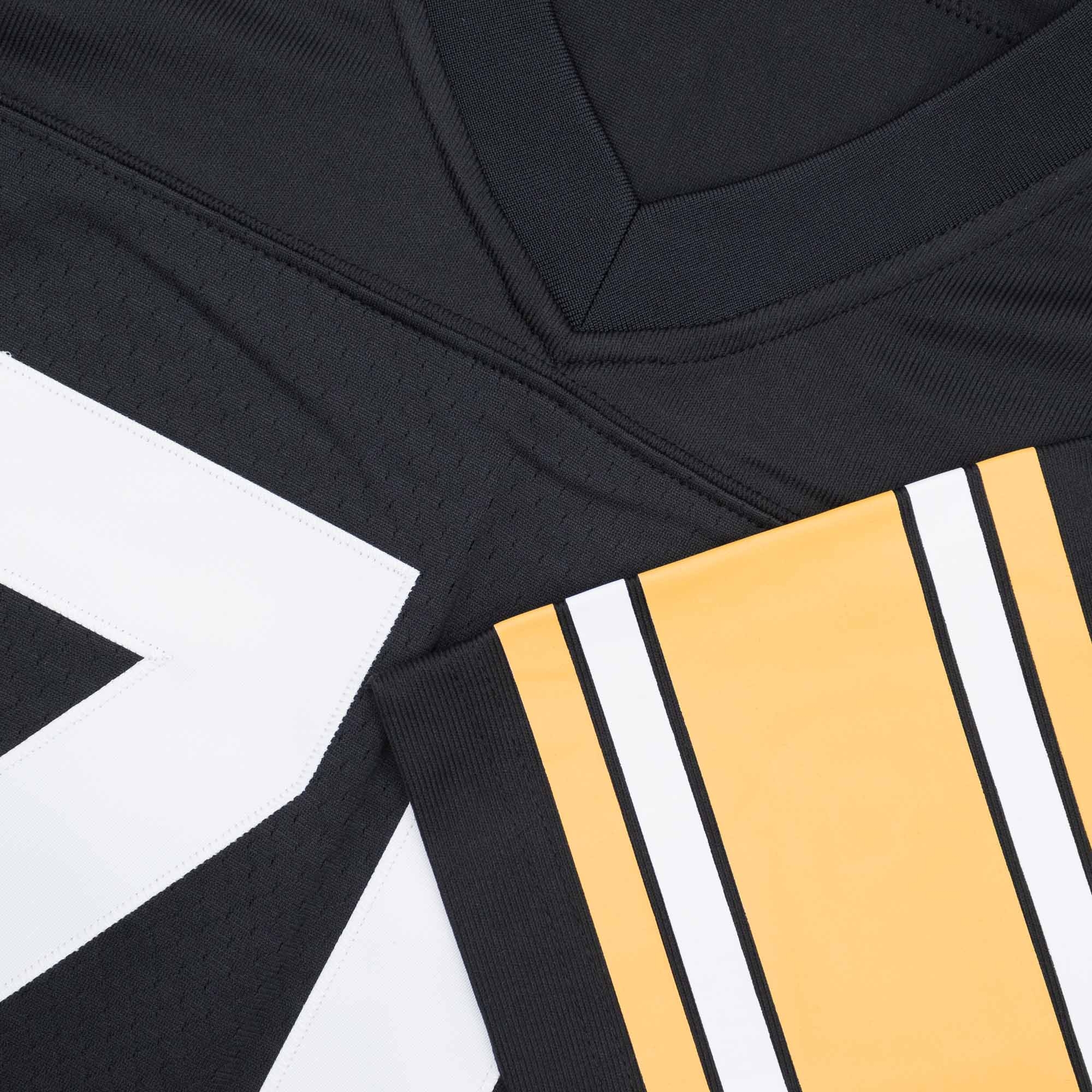 Das Pittsburgh Steelers NFL Throwback Trikot besteht zu 100% aus Polyester mit Mesh-Einsatz. Dieses Throwback Trikot im Traditional Fit sitzt etwas weiter an der Taille und den Ärmeln. Die Logos, Zahlen und Buchstaben sind hochwertig aufgestickt und entsprechen dem offiziellen NFL-Design der damaligen Zeit. Die Streifen auf den Ärmeln sind aufgedruckt. Das NFL-Mitchell & Ness Label (Legacy Collection) ist am Saum aufgenäht.