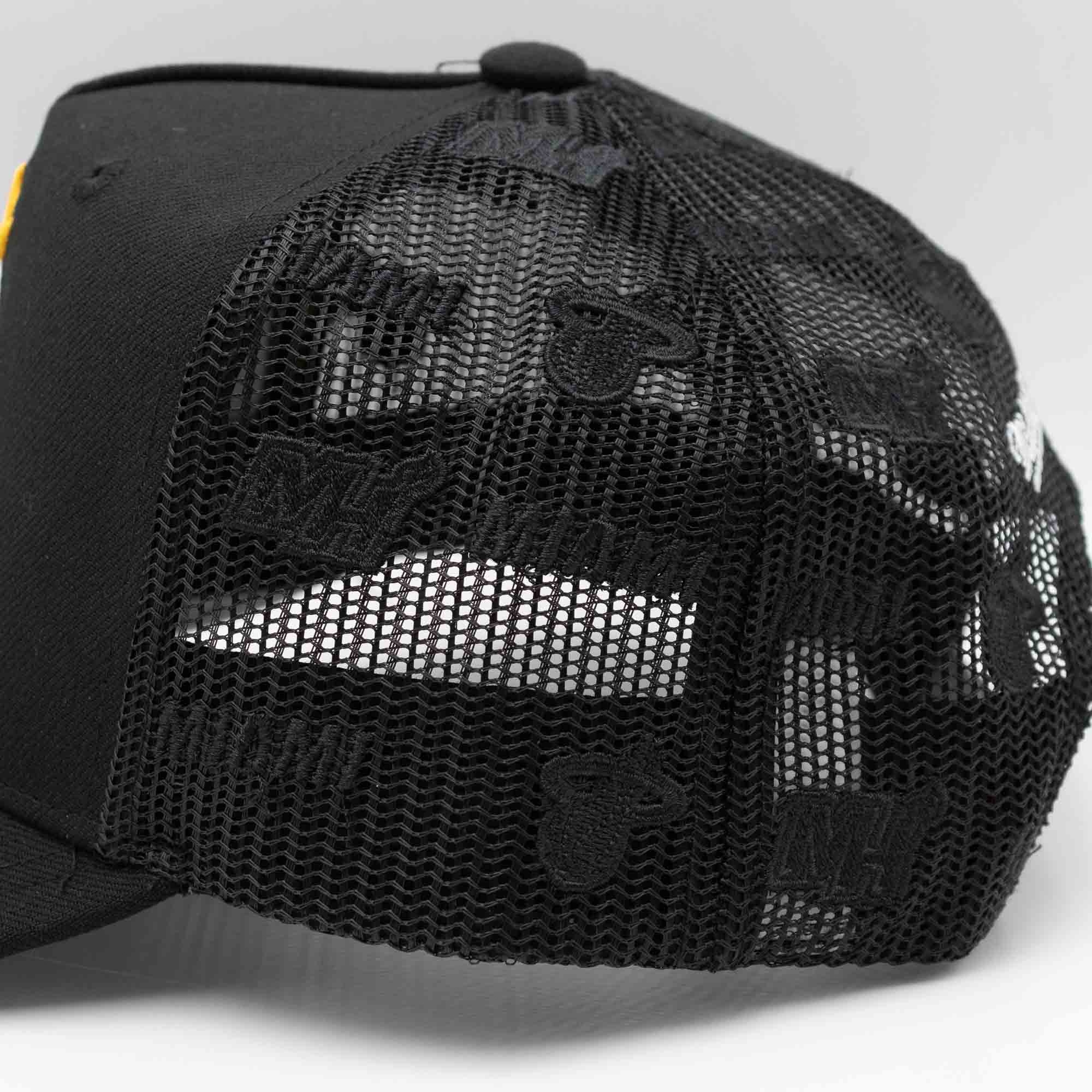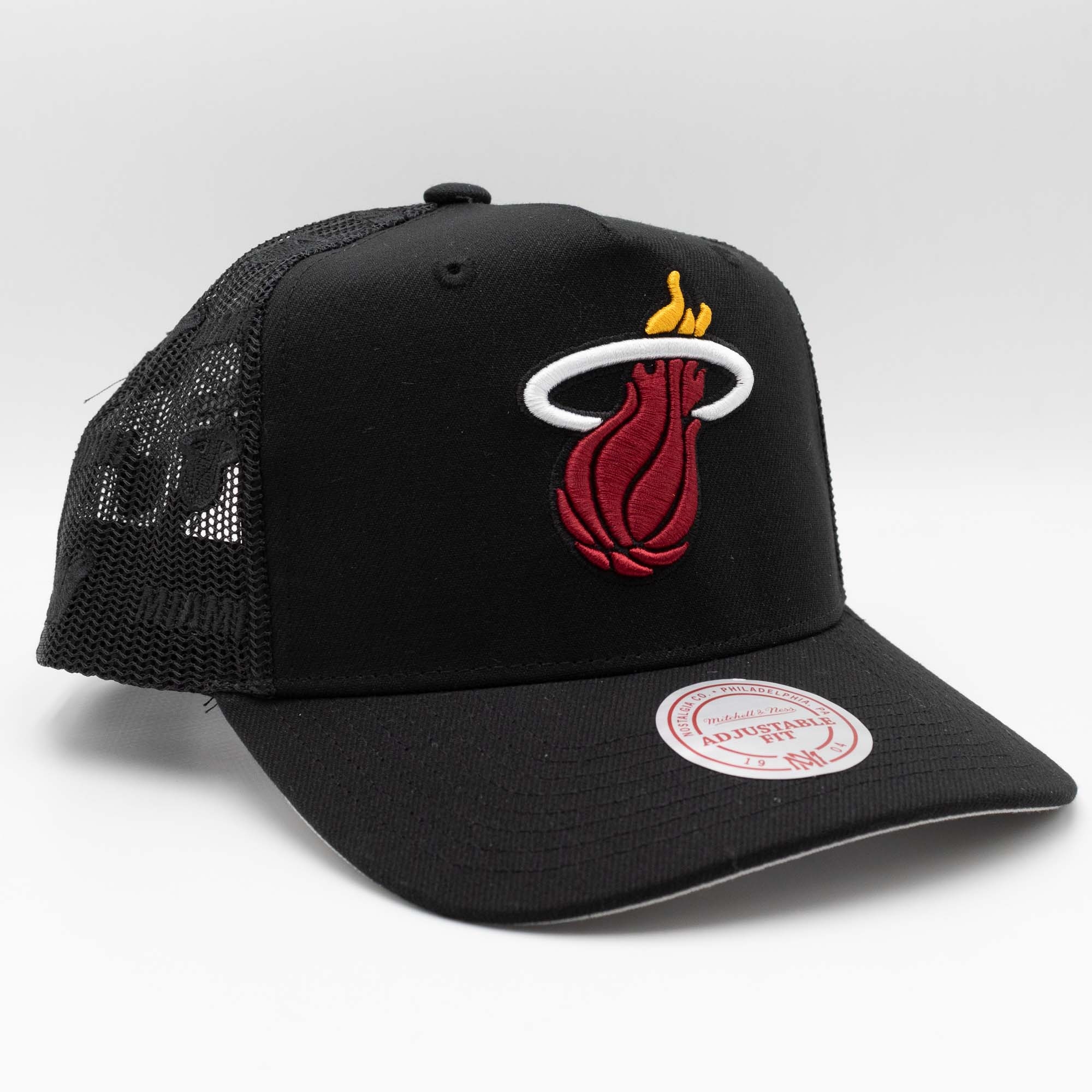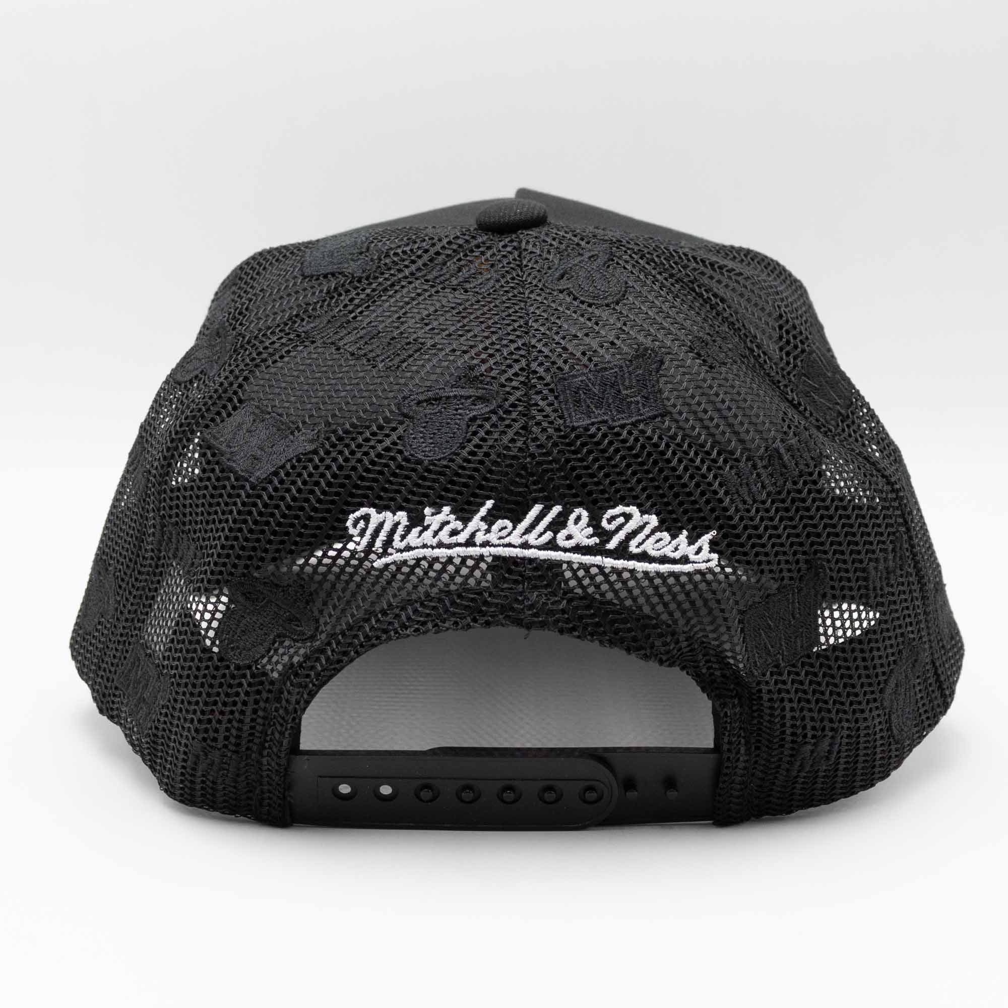 Mitchell & Ness NBA Adjustable Fit Trucker Cap von deinen Miami Heat im schwarzen Monogram Style.