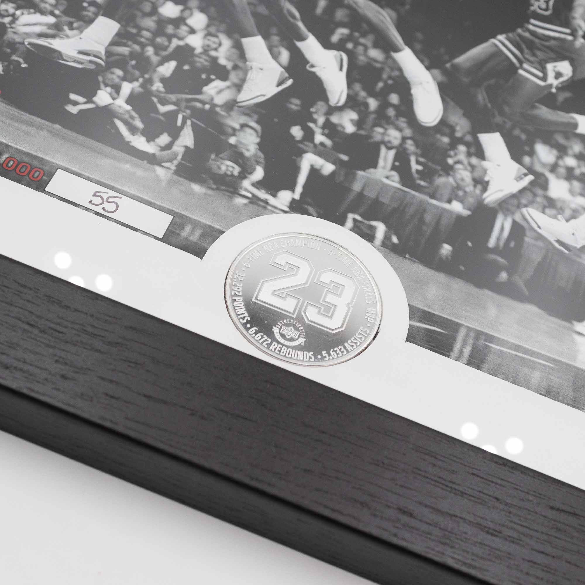Dieses 33 cm x 40 cm Kunstwerk mit doppelter Mattierung und einer Glasfrontplatte erinnert an den unvergesslichen Dunk der NBA-Legende Michael Jordan während des 1988 Slam Dunk-Wettbewerbs. Das ikonische Foto zeigt wie "Air Jordan" beim Dunk Contest durch die Luft gleitet. Außerdem ist das offizielle Teamlogo und Michael Jordan Schriftzug auf dem kunstvoll arrangierten Bild zu finden. Unterhalb des Fotos ist eine versilberte Münze mit 39 mm Durchmesser abgebildet, auf der seine Nummer 23 sowie seine größten Erfolge abgebildet sind.