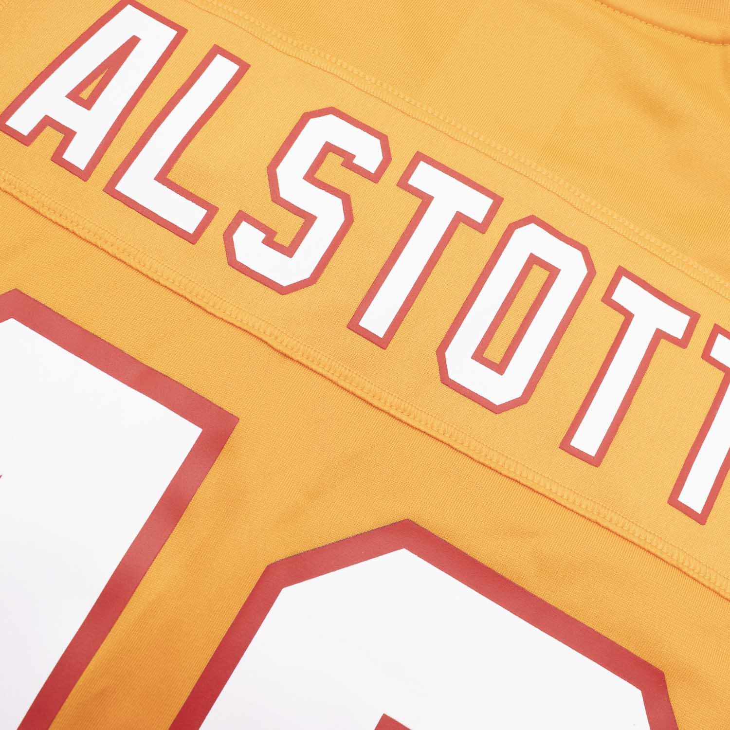 - Erstklassige Verarbeitung: Das Trikot besteht aus 100% Performance-Polyester und ist Teil der Nike Move to Zero Kollektion, gefertigt aus mindestens 75% recycelten Fasern. Alle Logos, Ziffern und Buchstaben sind hochwertig im Screen-Printing-Verfahren aufgedruckt, um ein langlebiges und authentisches Erscheinungsbild zu gewährleisten. Das Nameplate mit Mike Alstott's legendärem Namen ist zusätzlich aufgenäht, was dem Trikot einen besonderen Premium-Look verleiht.