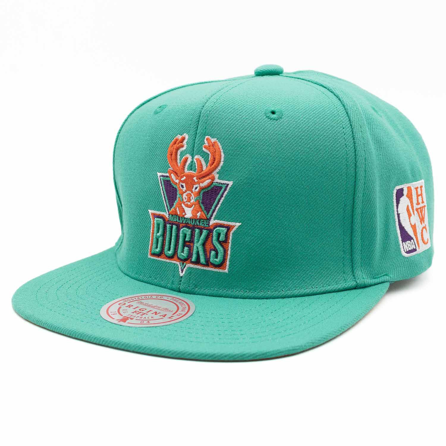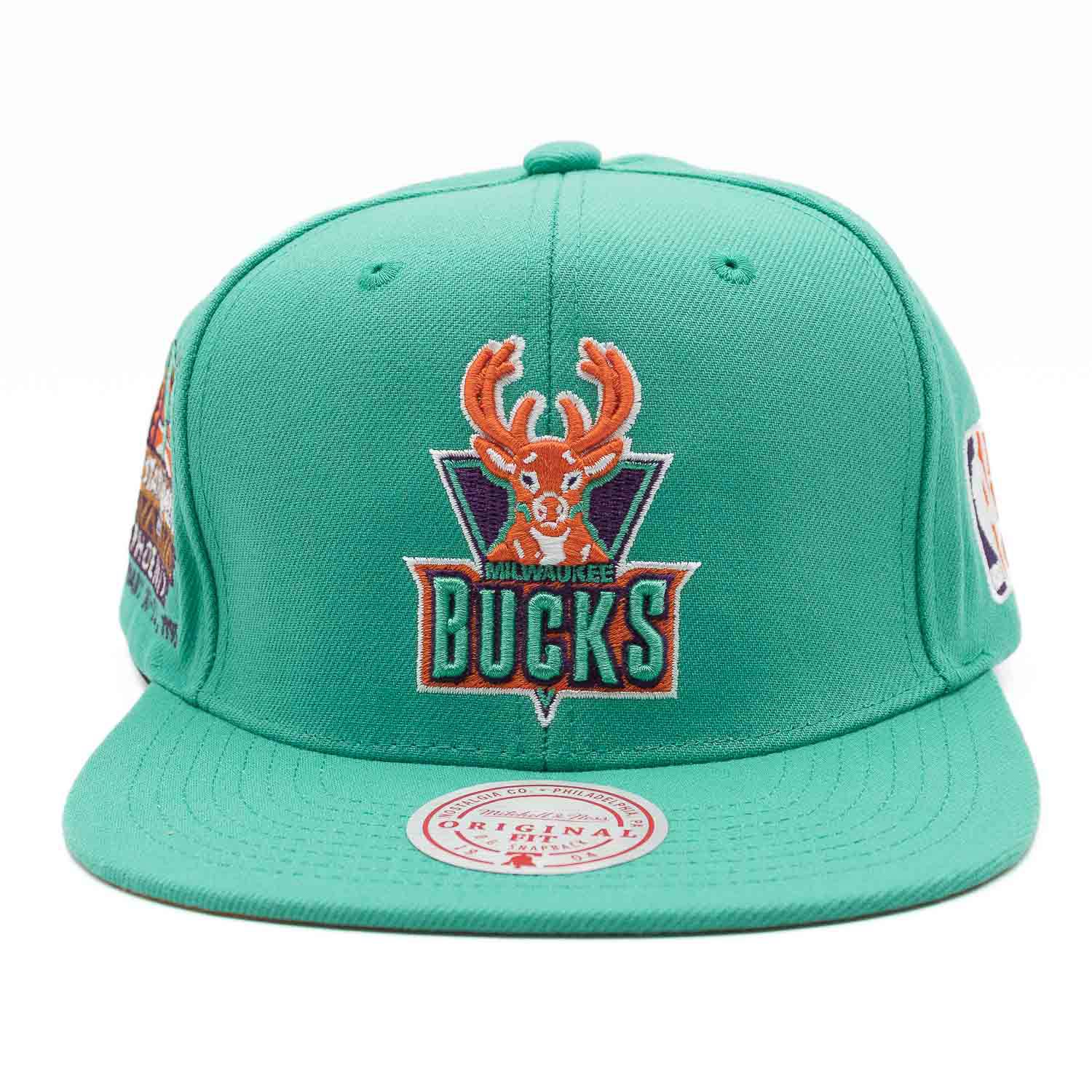 Mitchell & Ness NBA Original Fit Basketball Snapback Cap von den Milwaukee Bucks im Desert Green Design mit 1995 All-Star Weekend Phoenix Side Patch.