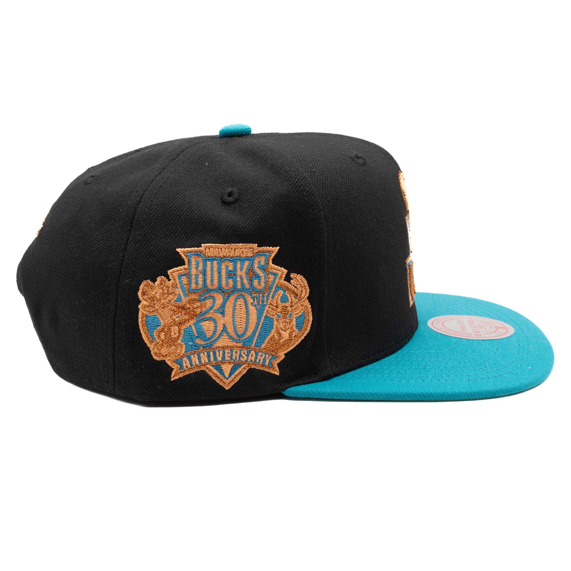 Mitchell & Ness NBA Original Fit Basketball Snapback Cap von deinen Milwaukee Bucks im zweifarbigen Make Cents Style mit Celebrating 30 Years Side Patch.
