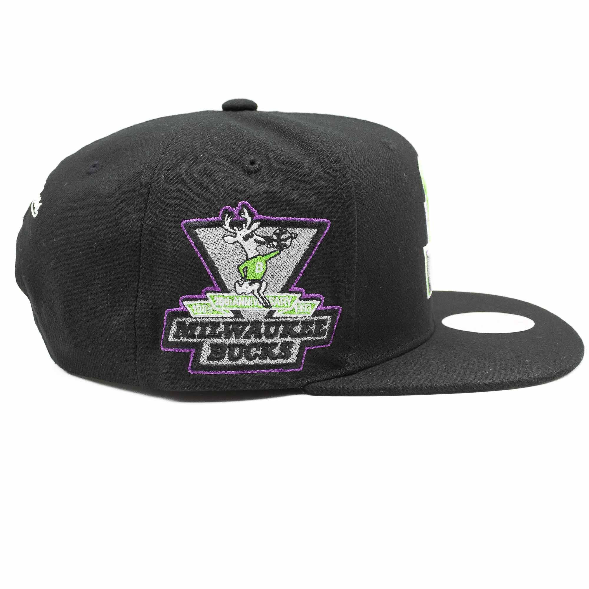 Die klassische Mitchell and Ness Basketball Snapback Cap kommt im edlen, schwarzen Design und hochwertig aufgestickten Logos. Die Vorderseite der Cap ist prominent mit dem Milwaukee Bucks Teamlogo im 3D-Design bestickt. Zusätzlich ziert die rechte Capseite der Bucks 25th Anniversary Patch. Abgerundet wird der Snapback Look mit dem Mitchell & Ness Schriftzug auf der Rückseite und der grauen Schirmunterseite.