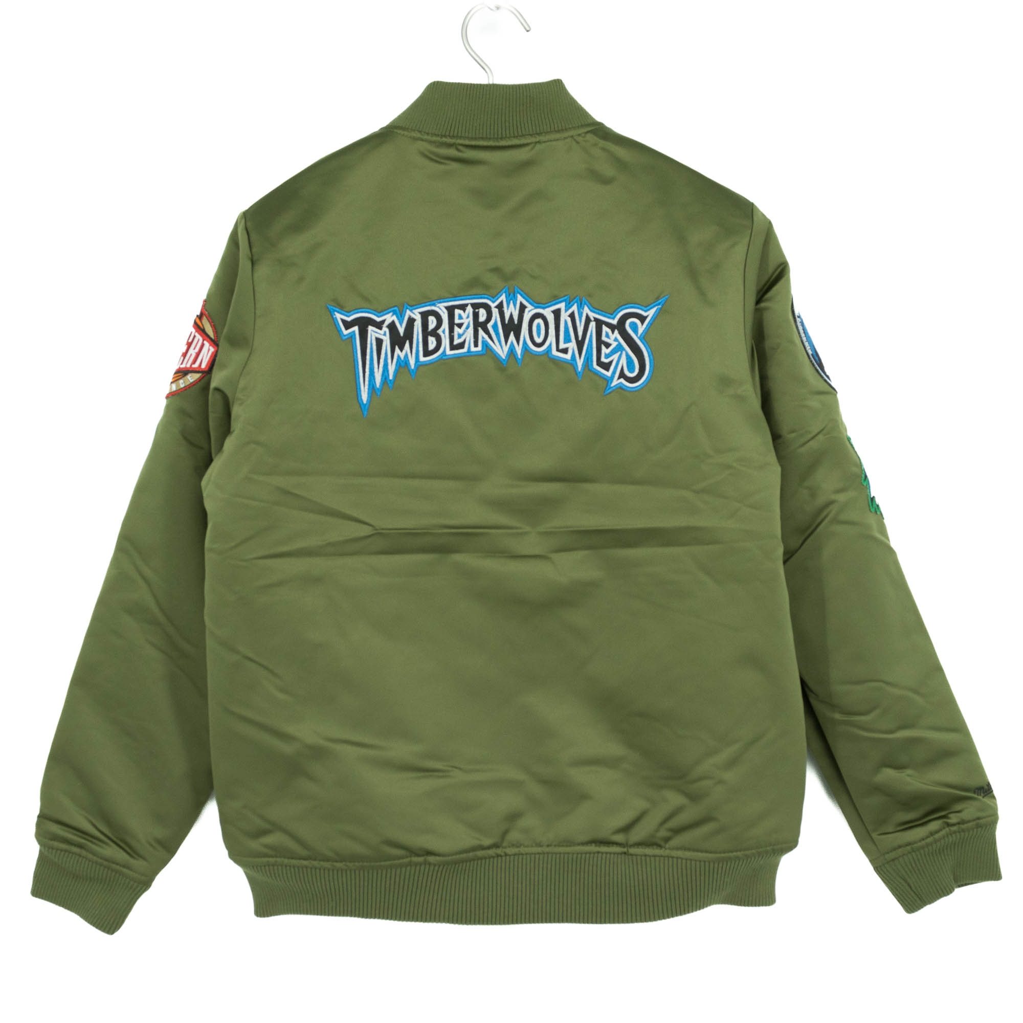 Mitchell & Ness NBA Herren Varsity Jacke von deinen Minnesota Timberwolves im olivgrünen Heavyweight Satin Design.