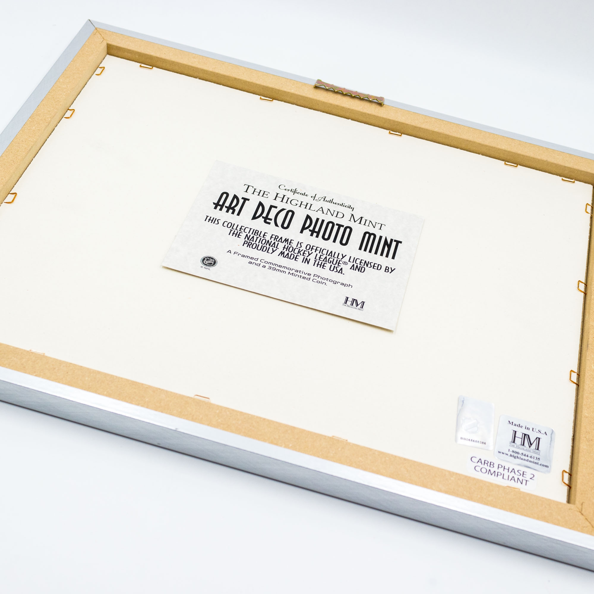 Dieses 40 cm x 33 cm Kunstwerk mit silbernen Rahmen und weißer Mattierung unter einer Glasfrontplatte zeigt ein grandioses Minnesota Wild Schwarz-Weiß-Arenafoto mit selektiv eingefärbter Eisfläche. Zusätzlich wird dieses einmalige Sammlerstück mit einer geprägten 39 mm versilberten Teamlogomünze hervorgehoben. Auf der Rückseite des Bilderrahmes befindet sich das Echtheitszertifikat. Es handelt sich um eine limitierte Auflage von nur 5.000 Stück und ist eine absolute Bereicherung für jedes NHL Fan-Cave. Dieses hochwertige Sammlerstück is offiziell von der NHL lizenziert und wird direkt in den USA von The Highland Mint hergestellt.