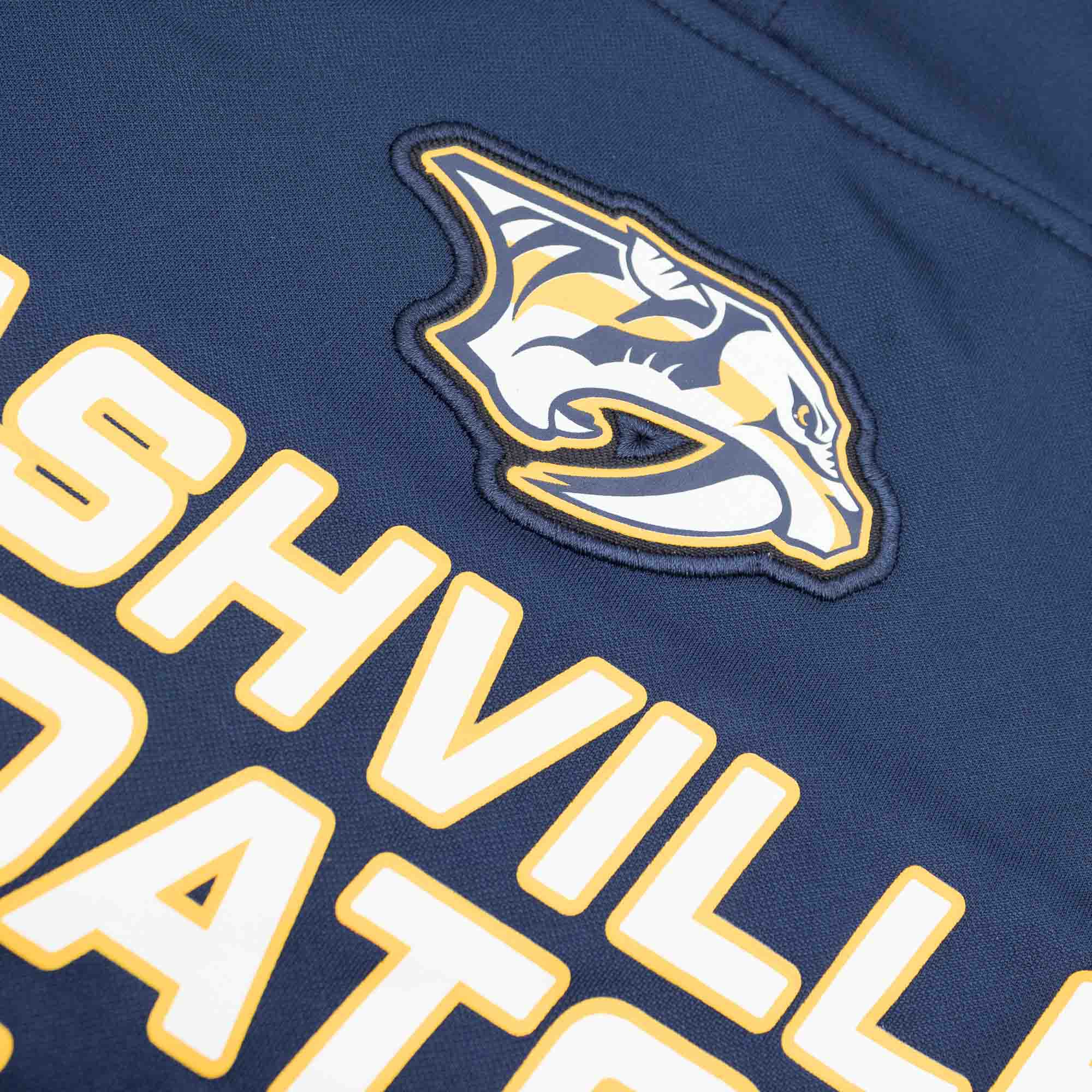 Der Defender Hoodie von Fanatics kombiniert Performance Eigenschaften mit einem modernen Nashville Predators Teamdesign. Die Vorderseite des Hoodies ist mit dem Nashville Predators Teamlogo und Team-Wordmark bedruckt, wobei das Teamlogo mit einer Stickumrandung verziert ist. Zusätzlich ist die Rückseite mit dem Teamnamen bedruckt und die Kapuze ist in den alternativen Teamfarben ausgestattet.