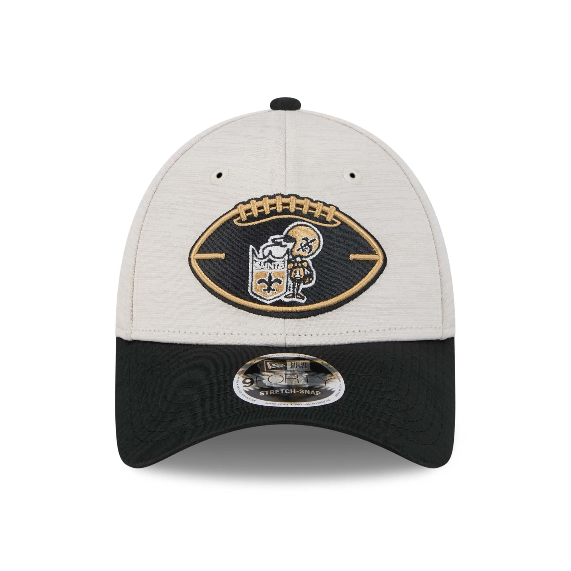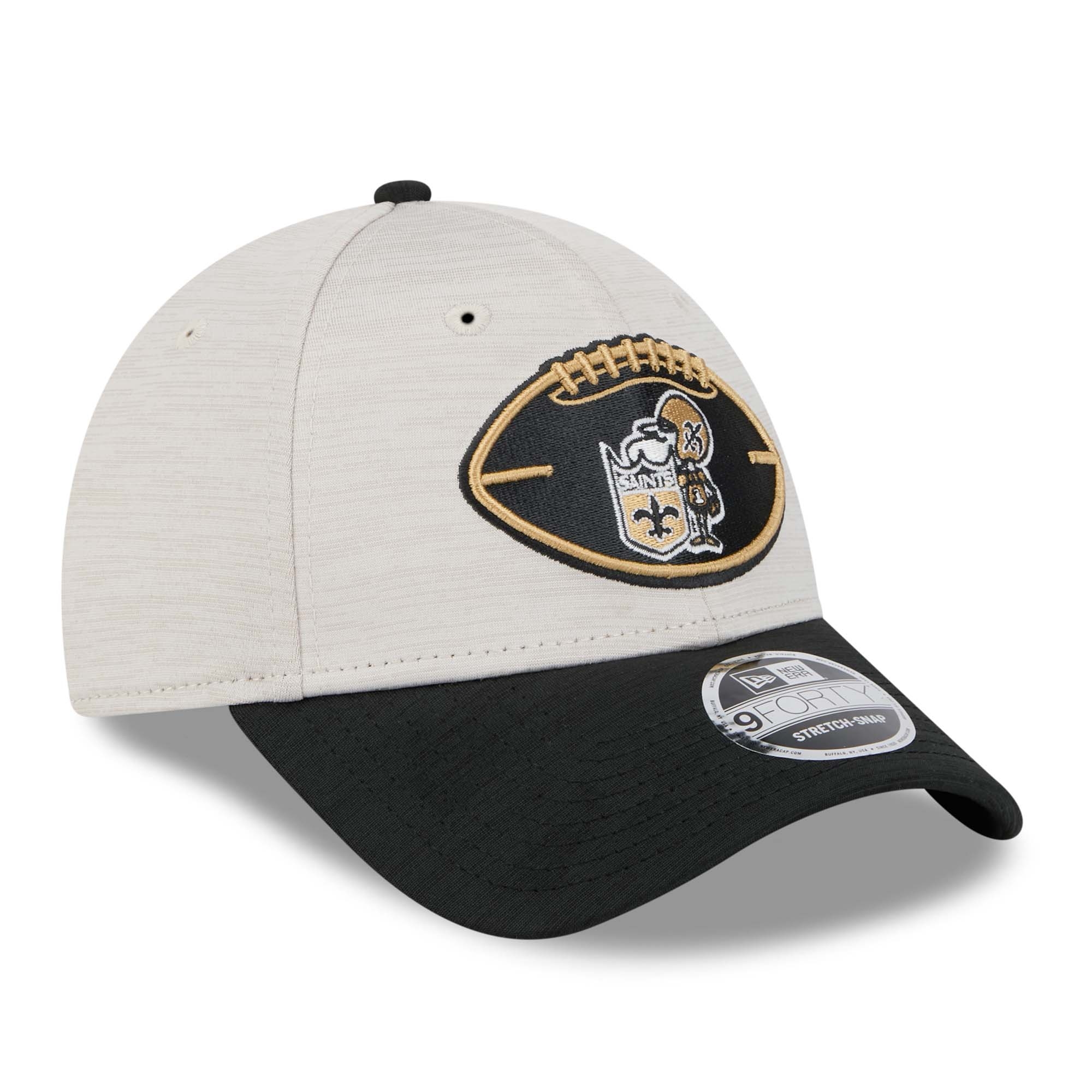 New Era American Football Stretch-Snap Cap von deinen New Orleans Saints im 9FORTY Style aus der klassischen Throwback 2024 NFL On-Field Sideline Kollektion.