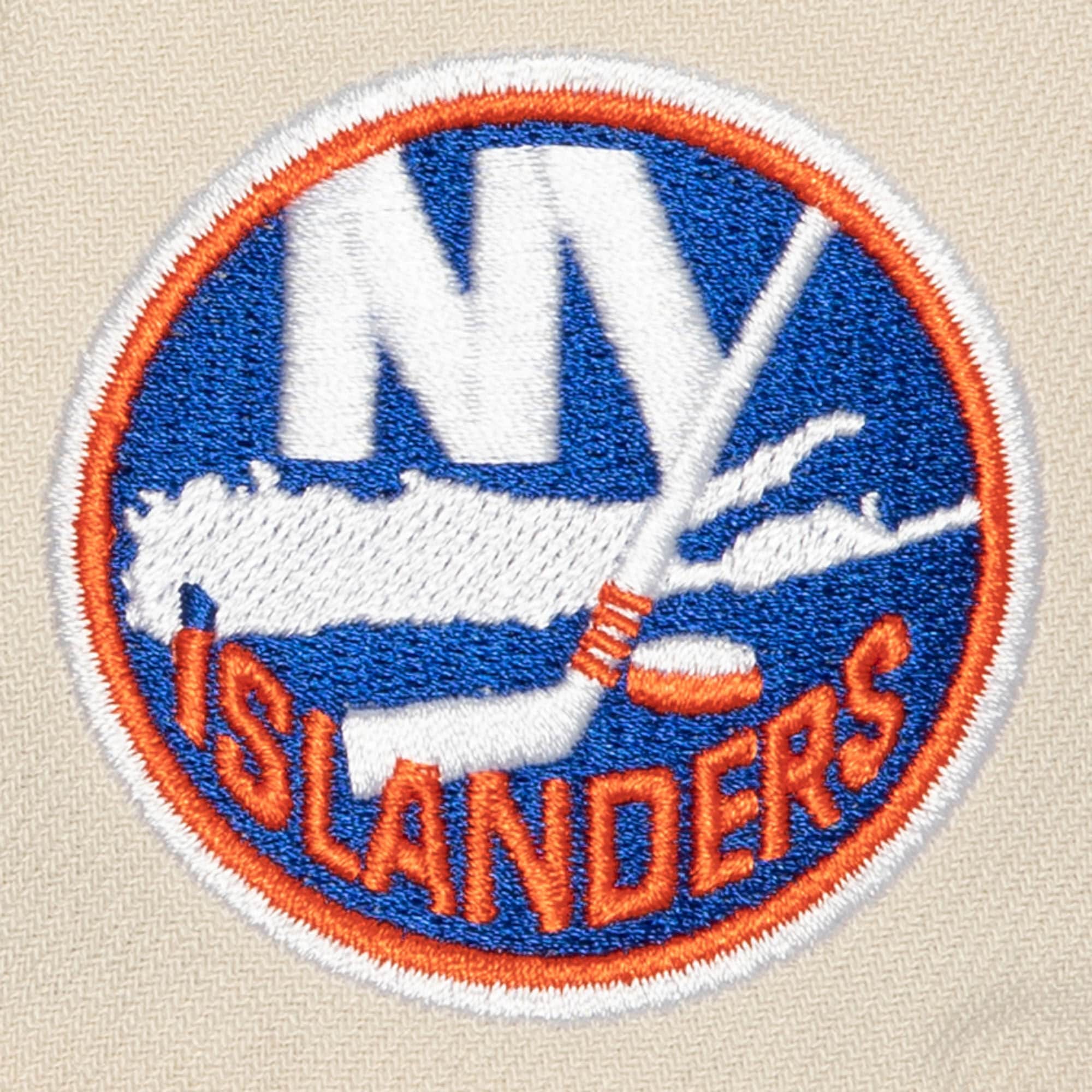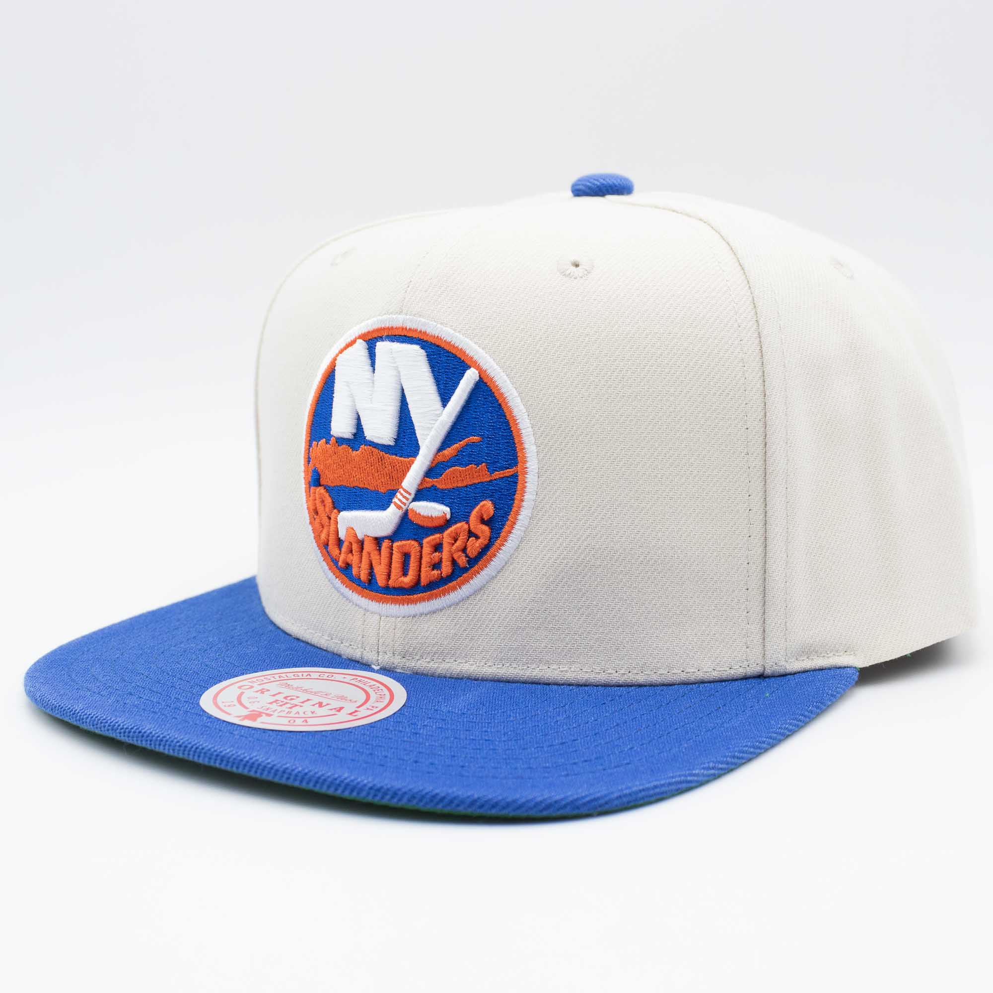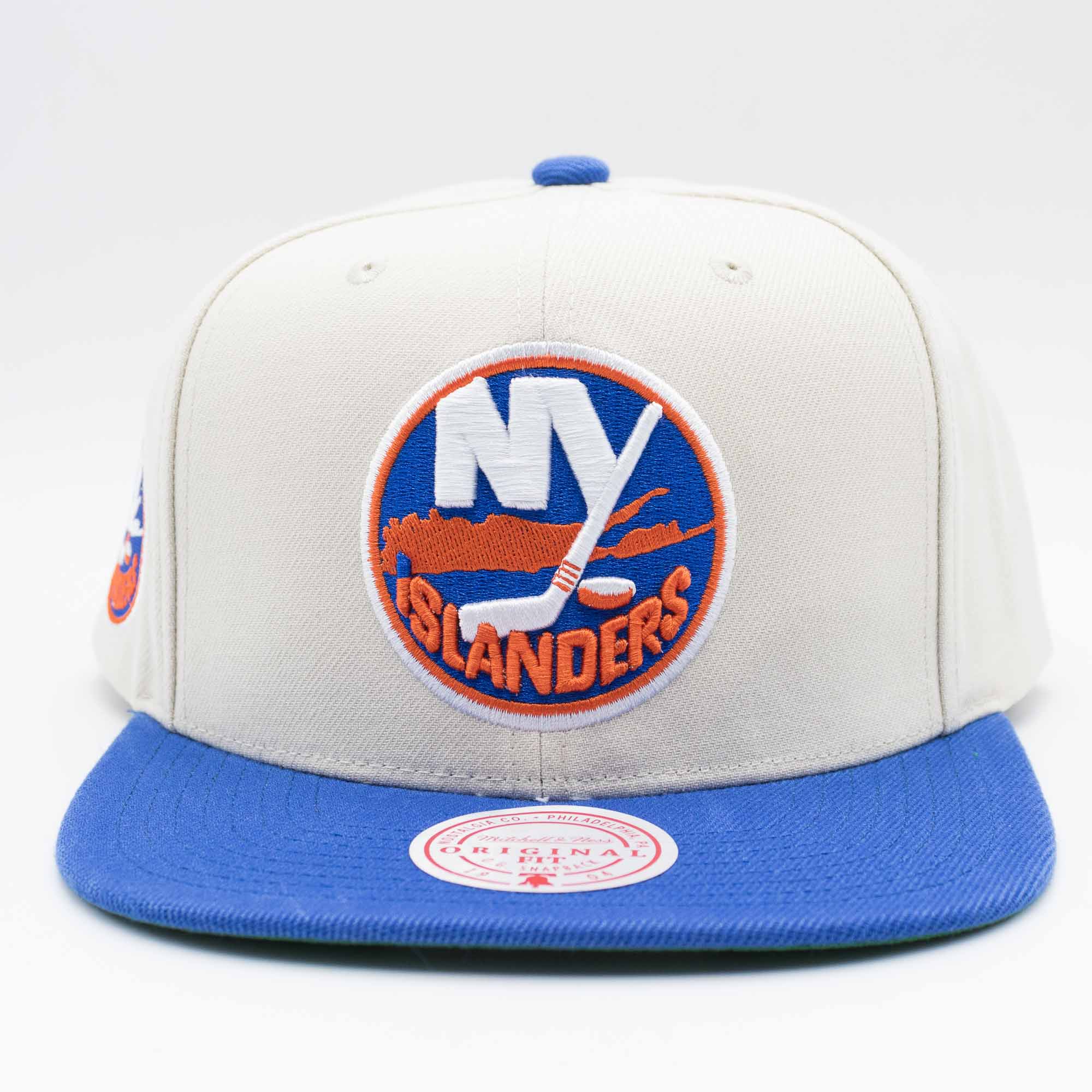 Mitchell & Ness NHL Original Fit Eishockey Snapback Cap von deinen New York Islanders im zweifarbigen Off-White Vintage Style.