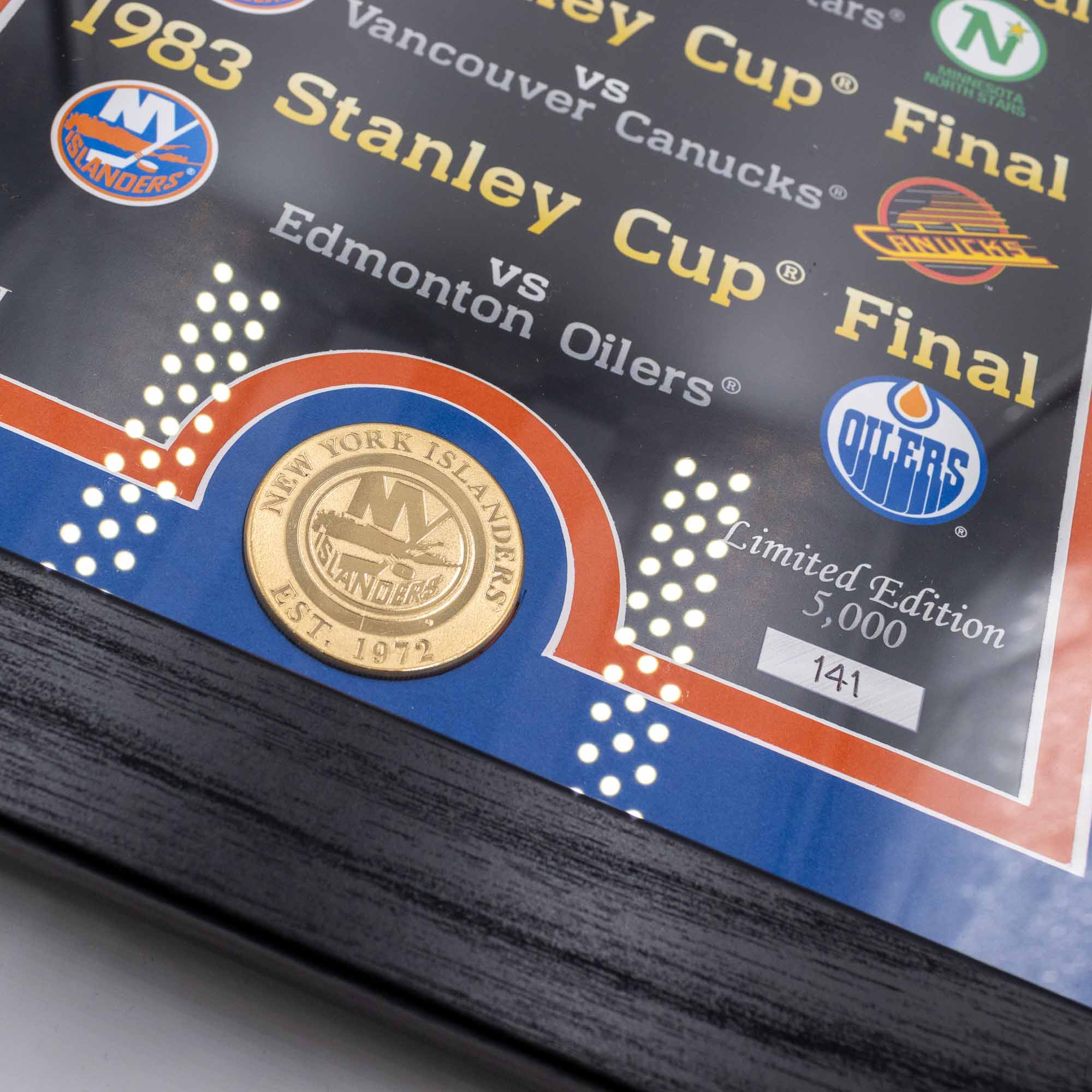 Eine limitierte Auflage zum Gedenken an den vierfachen Stanley-Cup-Sieger New York Islanders! Dieser 30 x 50 cm große Rahmen mit doppelter Mattierung und einer Glasfrontplatte verfügt über ein individuell nummeriertes 38 x 17 cm großes Erinnerungsfoto, auf dem jeder ihrer Stanley Cup Championships aufgeführt ist, sowie eine geprägte 39-mm-Gedenkmünze aus massiver Bronze des Teams.
