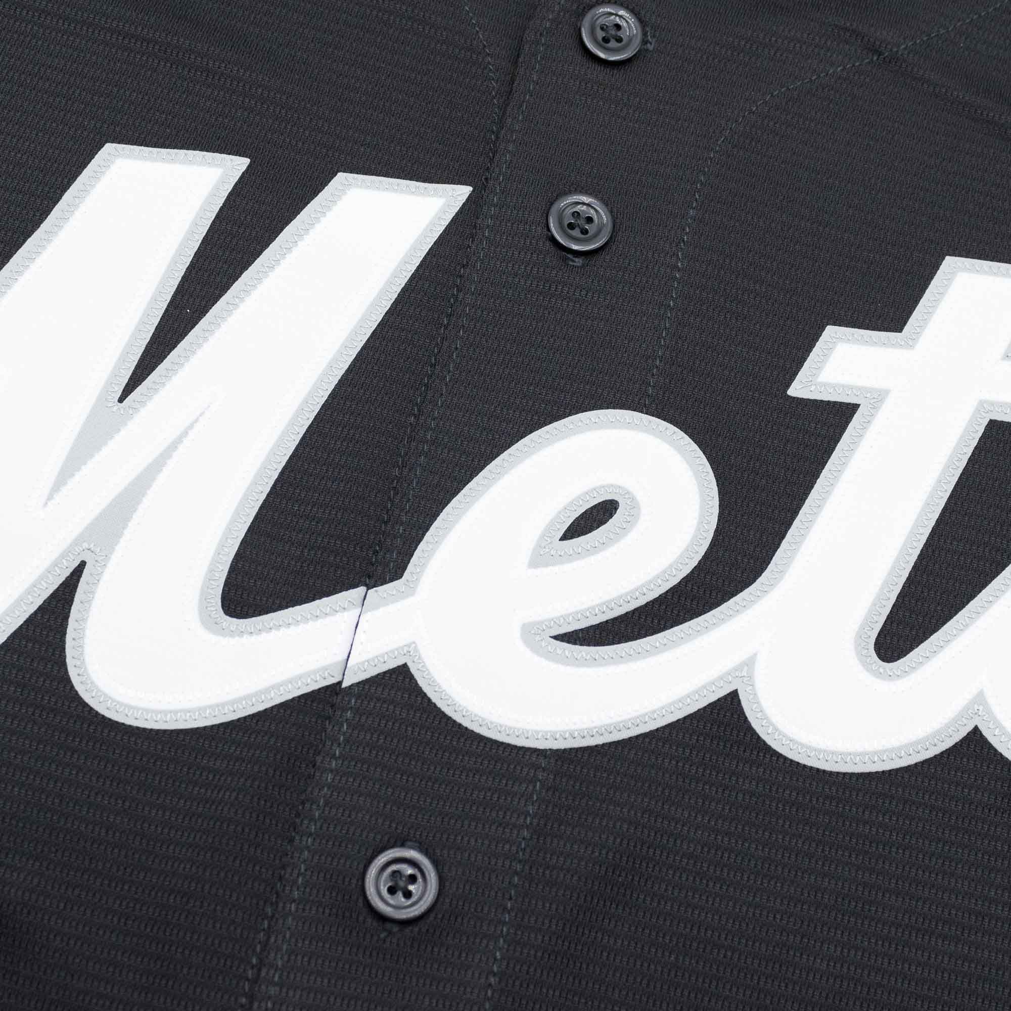Mit dem Special Edition Black Fashion MLB Jersey bringst du deinen New York Mets Support in den Alltag! Das komplett schwarze Baseball Jersey mit den grau-weißen Teamlogos sorgt für Understatement und Style. Mit der durchgehenden Knopfleiste auf der Vorderseite kannst du das Jersey sowohl als offenes Hemd oder als lässiges Shirt tragen. Das grau-weiße New York Mets Teamlogo ist als hochwertig gewebter Twill Patch aufgebracht. Abgerundet wird das Design durch das Nike Swoosh Logo direkt auf der rechten Brustseite und dem Genuine Merchandise Shield am Hemdsaum. Das Hersteller-Label im Nacken ist ebenfalls gedruckt, um einen optimalen Tragekomfort zu gewährleisten.
