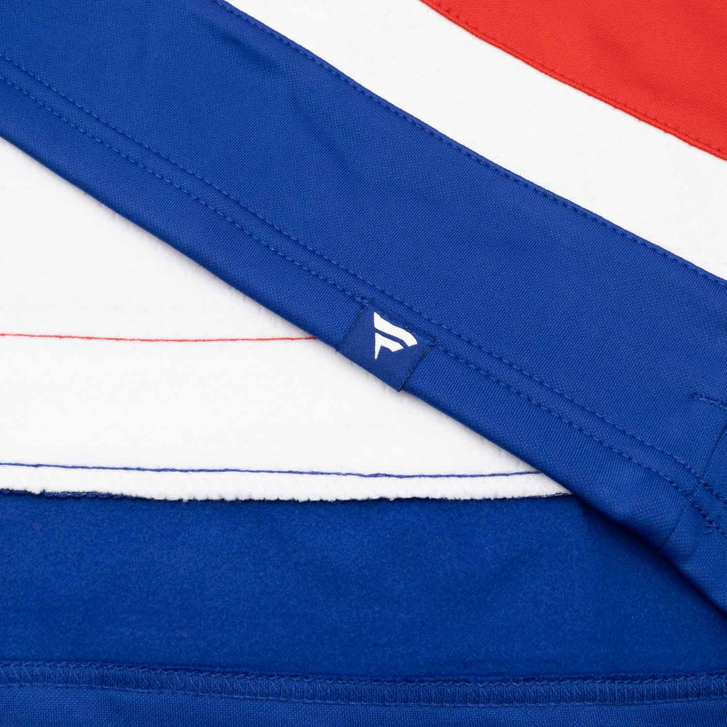- Aufgenähte Streifen: Authentische, aufgenähte Streifen an Ärmeln und Bund im klassischen NHL-Jersey-Look.