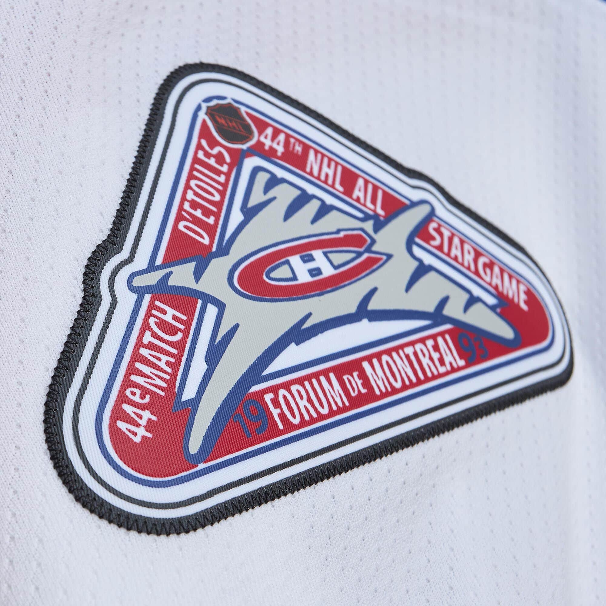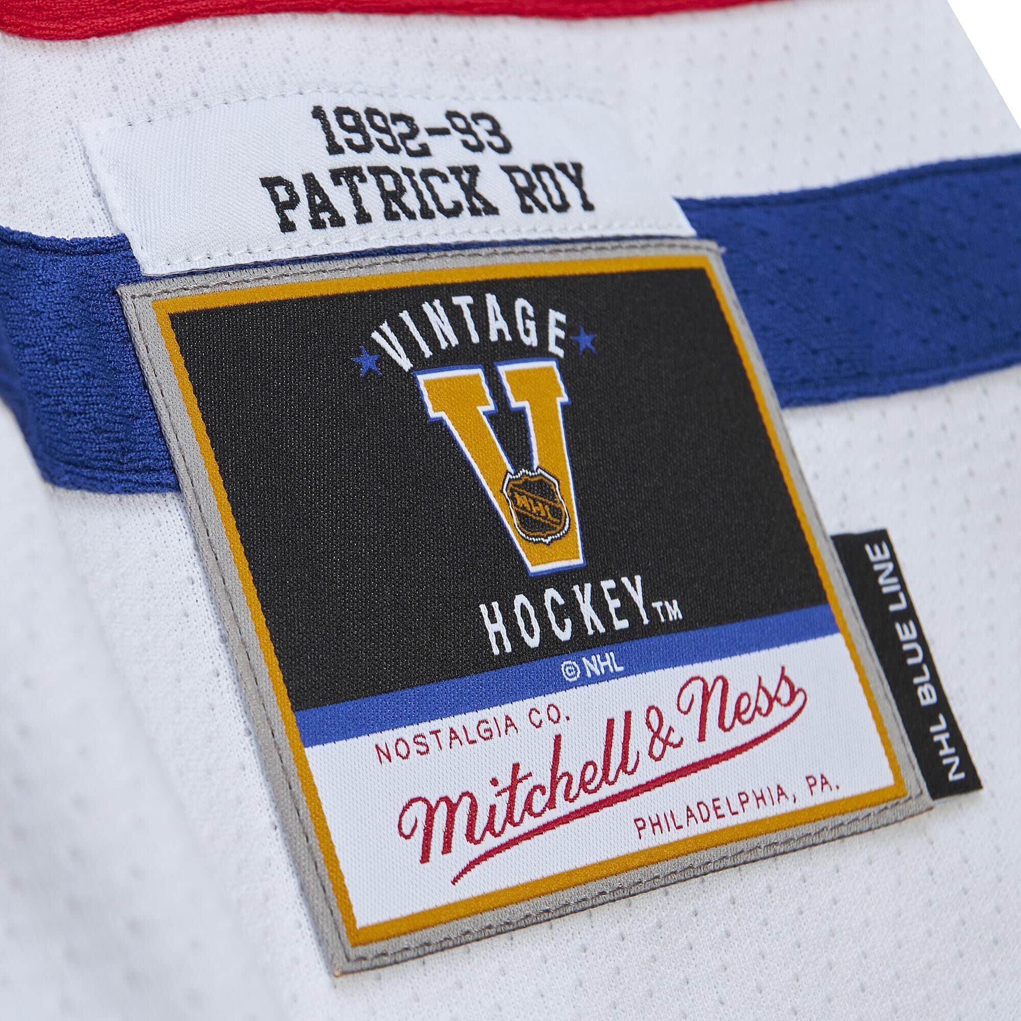 Mitchell & Ness NHL Herren Blue Line Eishockey Trikot von Montreal Canadiens Legende Patrick Roy aus der Saison 1992-93 mit All-Star Game Patch.