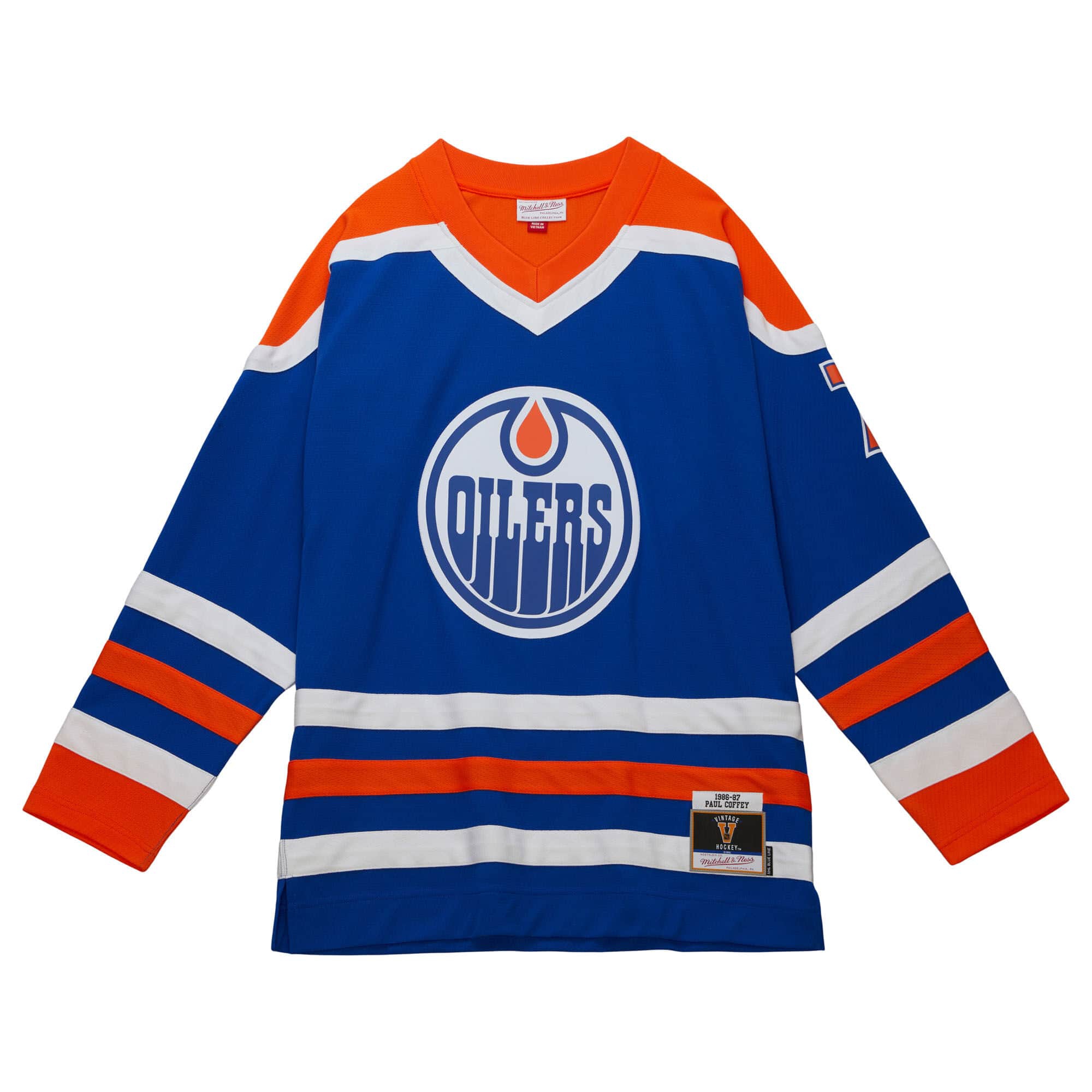 Mitchell & Ness NHL Herren Blue Line Eishockey Trikot von Edmonton Oilers Legende Paul Coffey aus der Saison 1986-87.