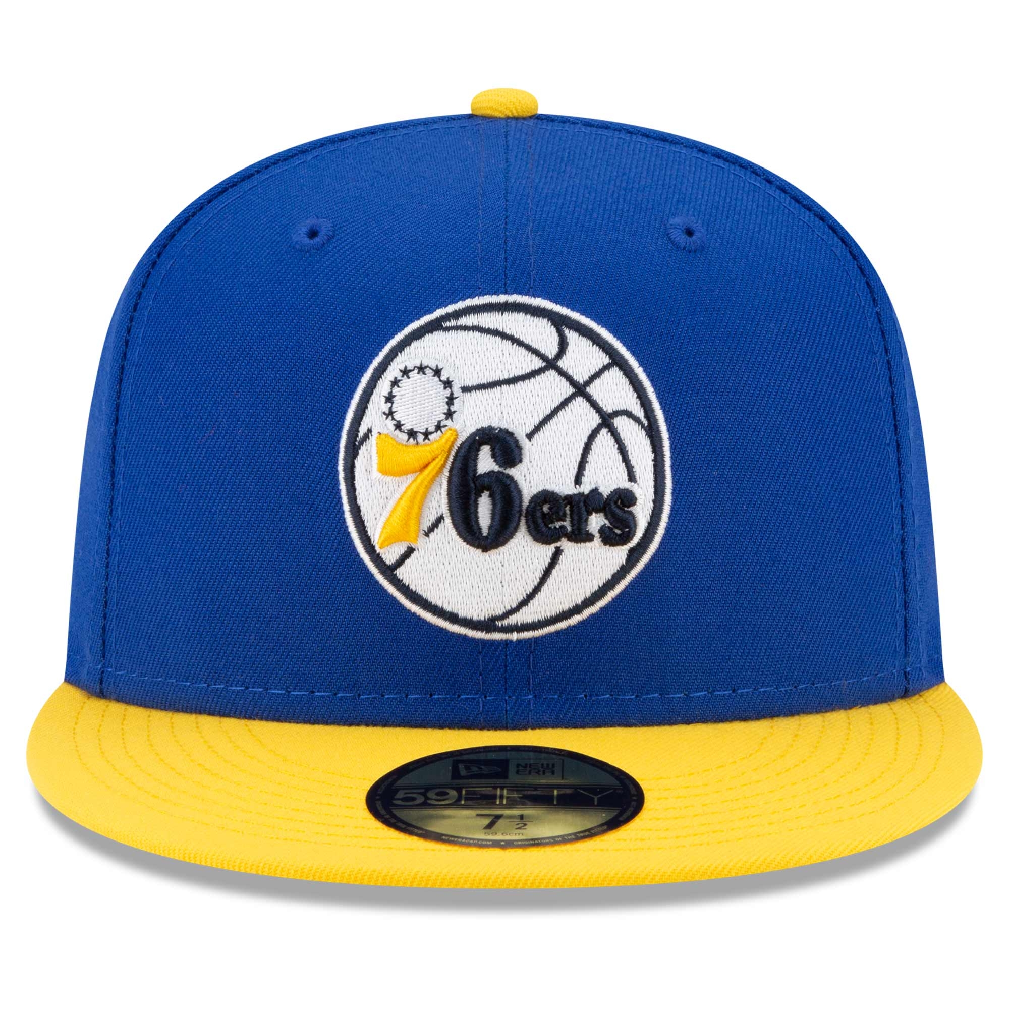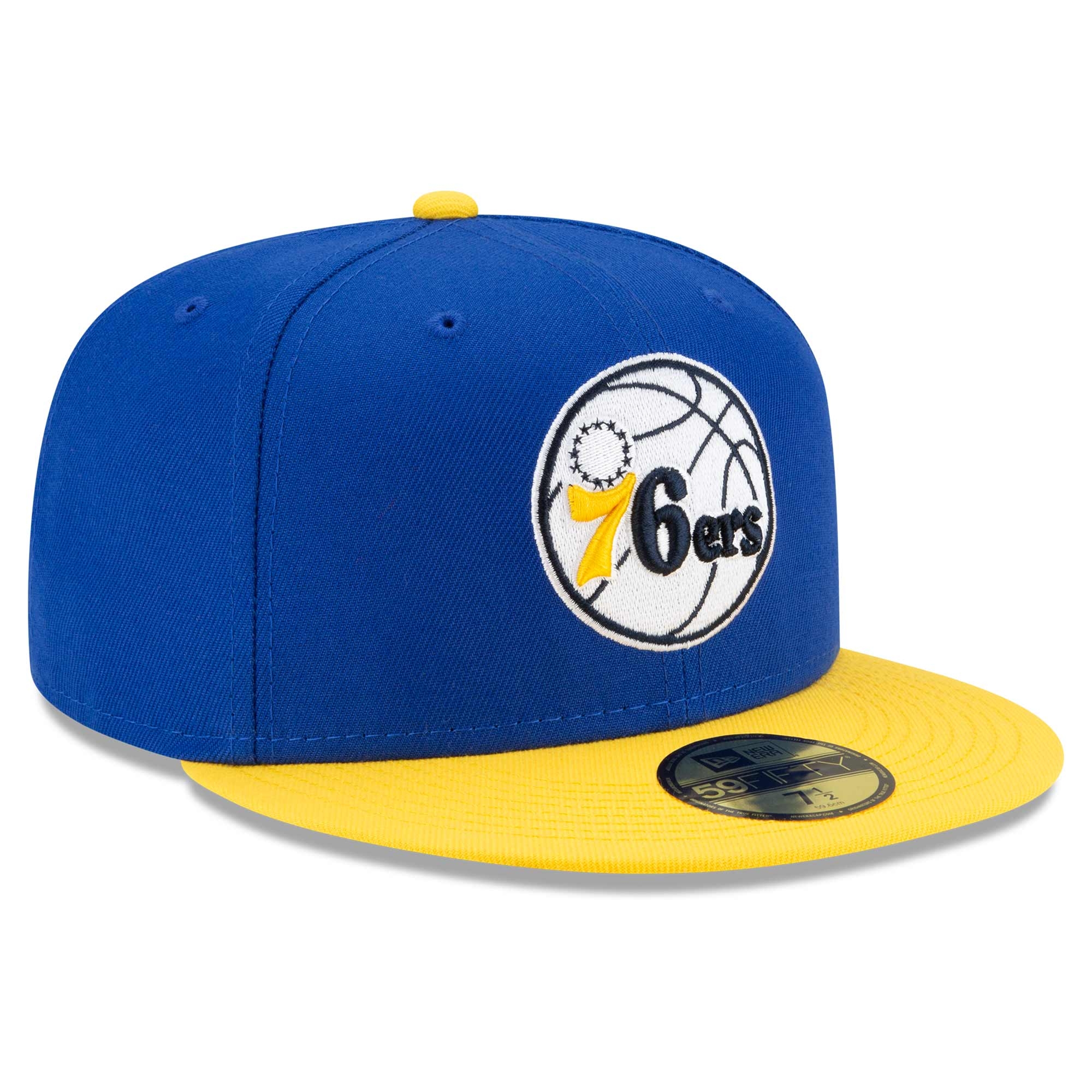 New Era Basketball 59FIFTY Fitted Cap von deinen Philadelphia 76ers aus der 2021 NBA Flash Kollektion im Blau-Gelben Colorpack Design.