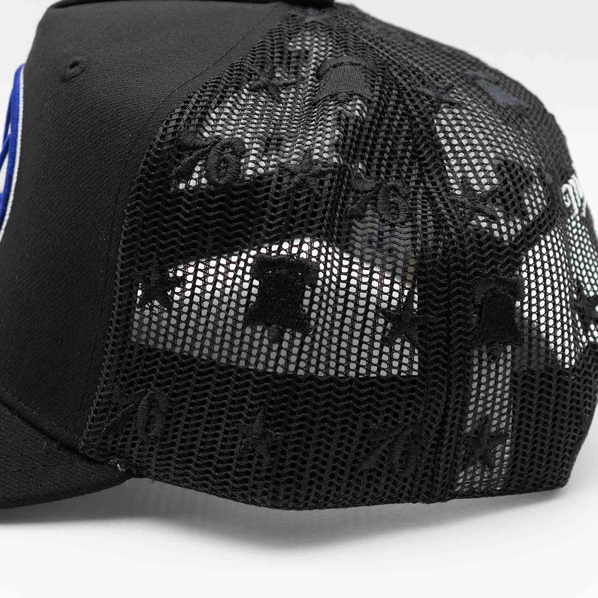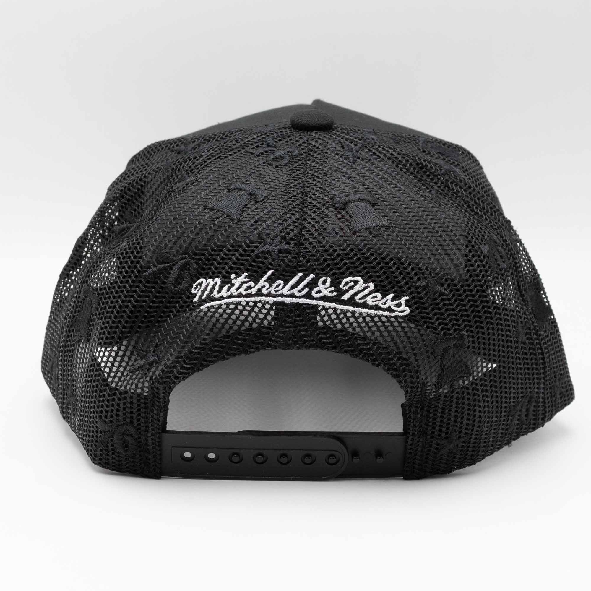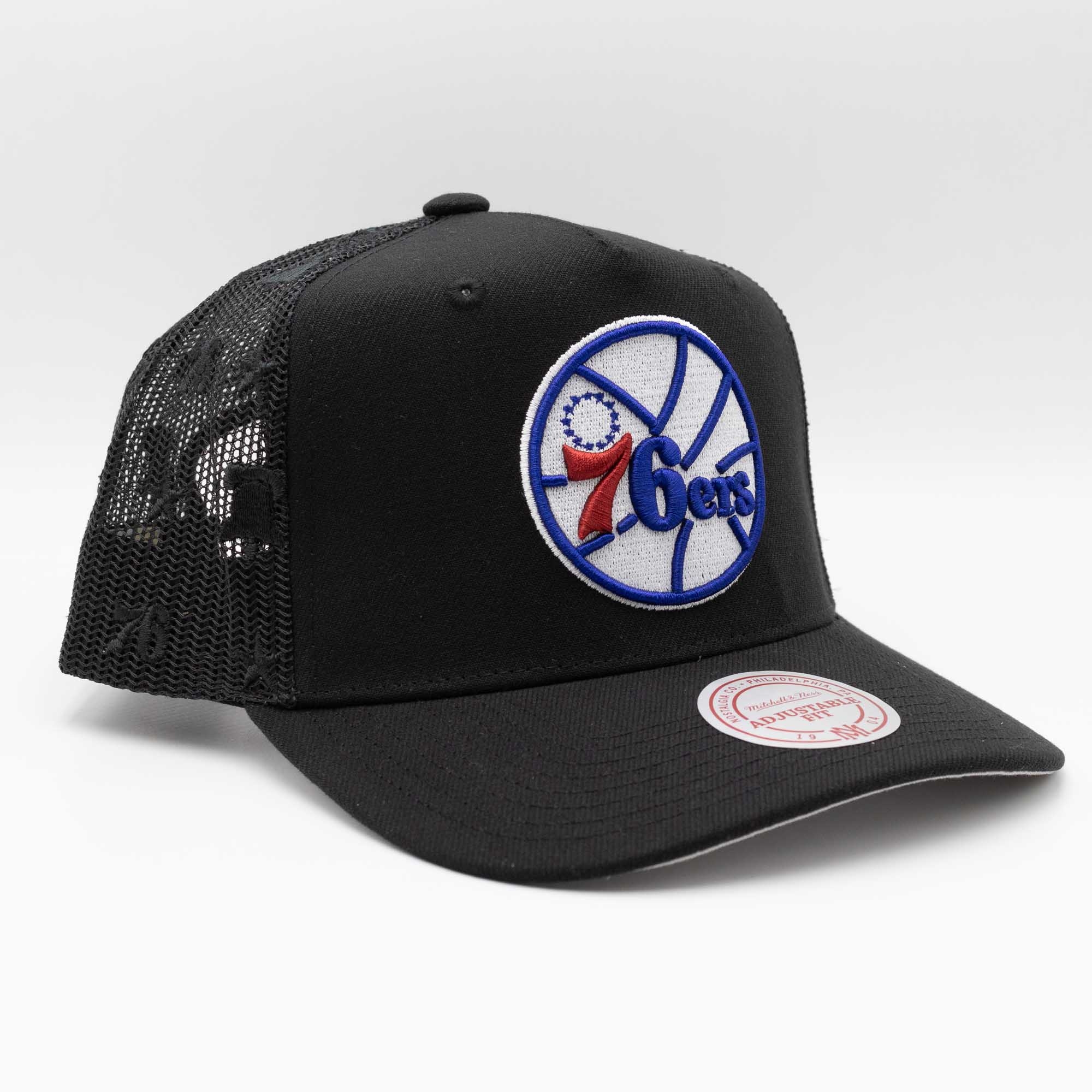 Mitchell & Ness NBA Adjustable Fit Trucker Cap von deinen Philadelphia 76ers im schwarzen Monogram Style.