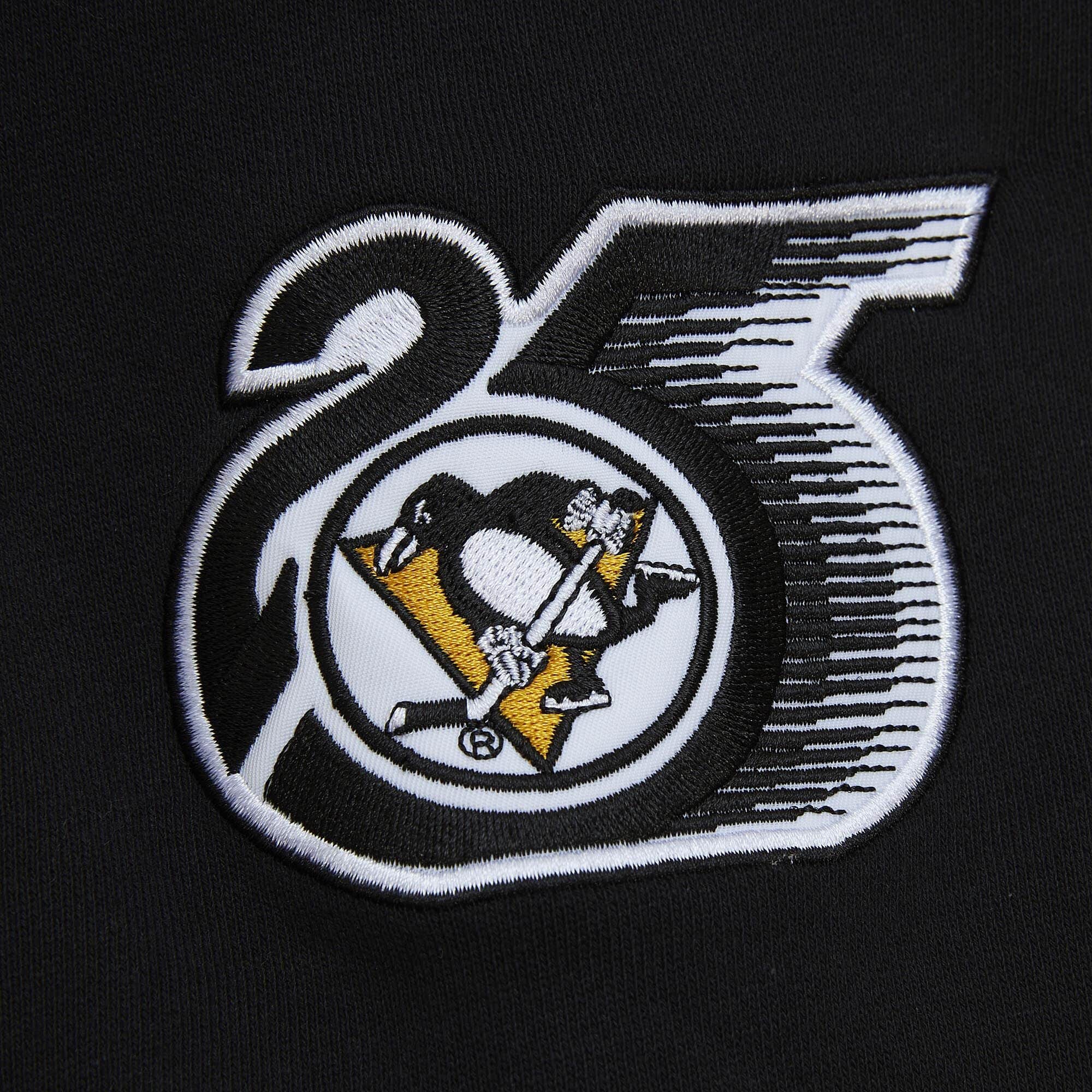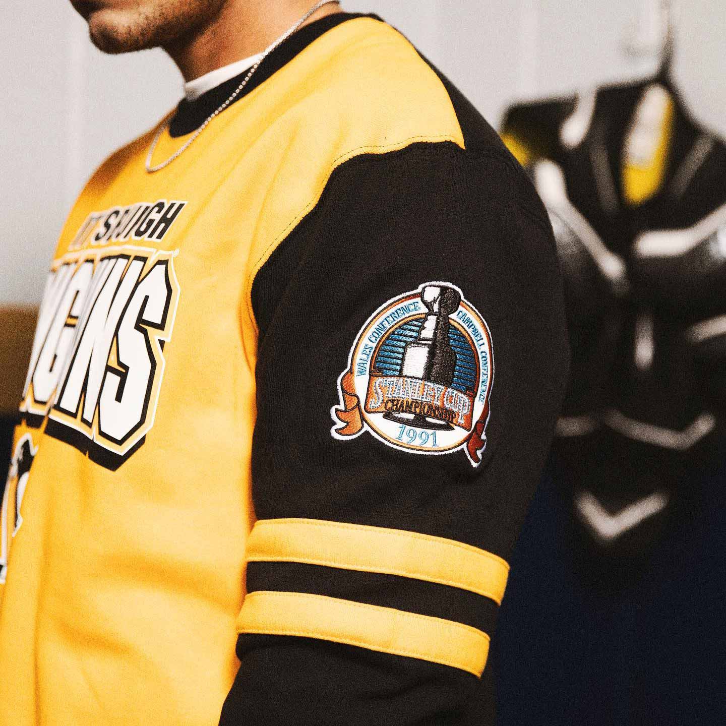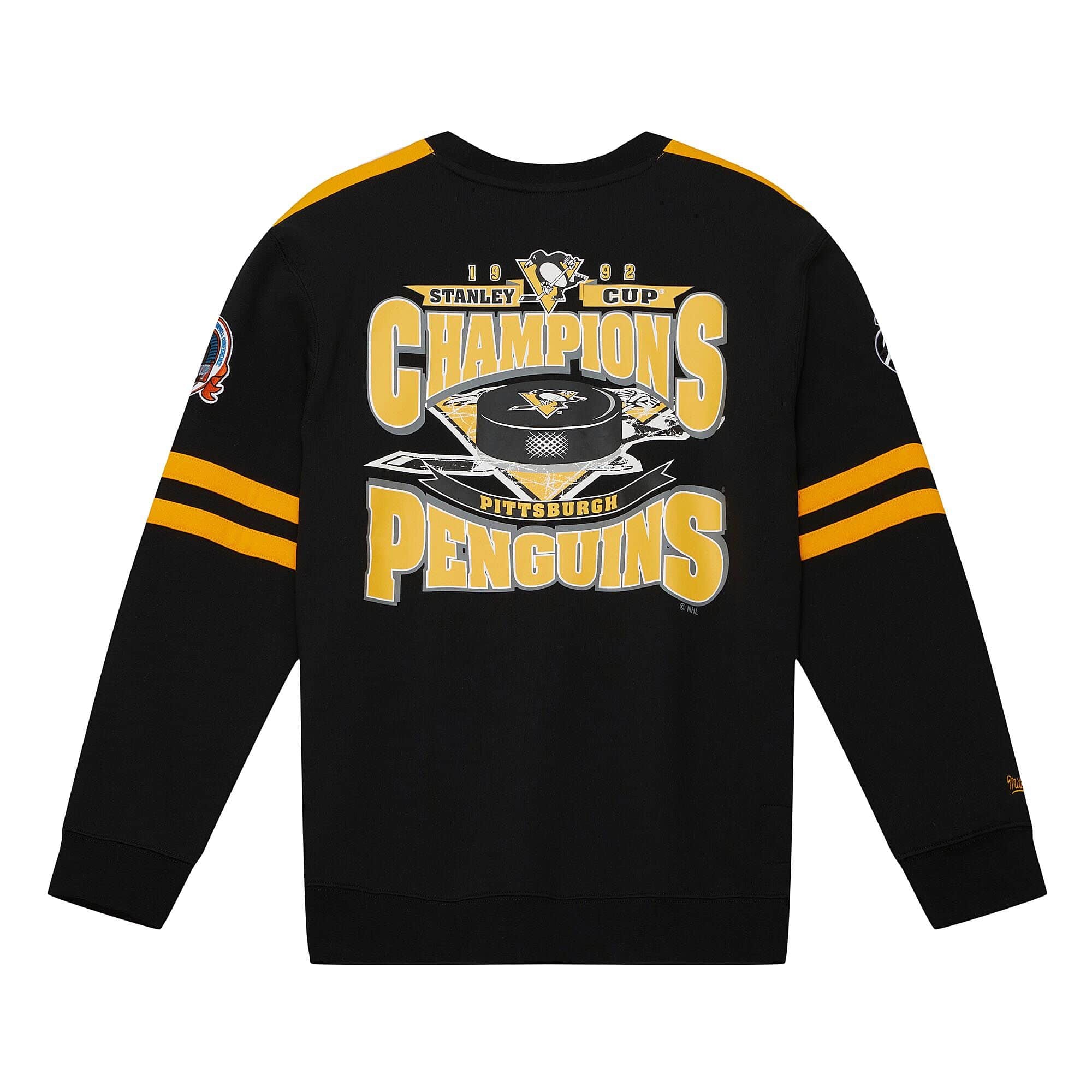 Hochwertiger Mitchell & Ness Premium Vintage Hockey Pullover im eindeutigen NHL-Teamdesign. Die Vorderseite ist mit dem Pittsburgh Penguins Schriftzug und Team Logo dekoriert und aufgedruckt. Die Rückseite ist mit dem Stanley Cup Champions Logo bedruckt. Passend dazu sind die Ärmel mit dem Stanley Cup Patch und dem Anniversary Logo bestickt. Abgerundet wird der Eishockey-Look mit den aufgenähten Ärmelstreifen im Trikotdesign und dem Mitchell & Ness Schriftzug am rechten Ärmelende. Das extra weiche Baumwoll-Polyester-Fleece sorgt für ein super angenehmes und warmes Tragegefühl. Das Design ist Alltagstauglich und sorgt für deinen täglichen NHL-Style.